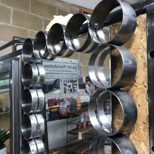Industrial style mirror handcrafted using individual metal rings welded together.
