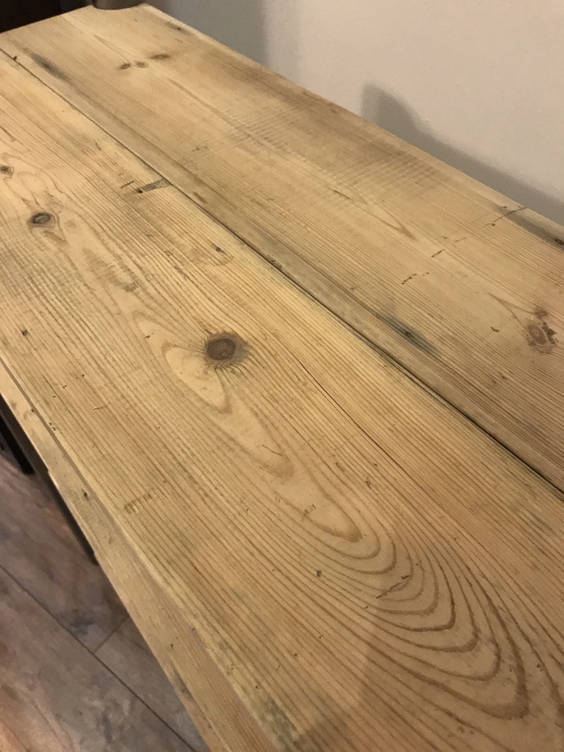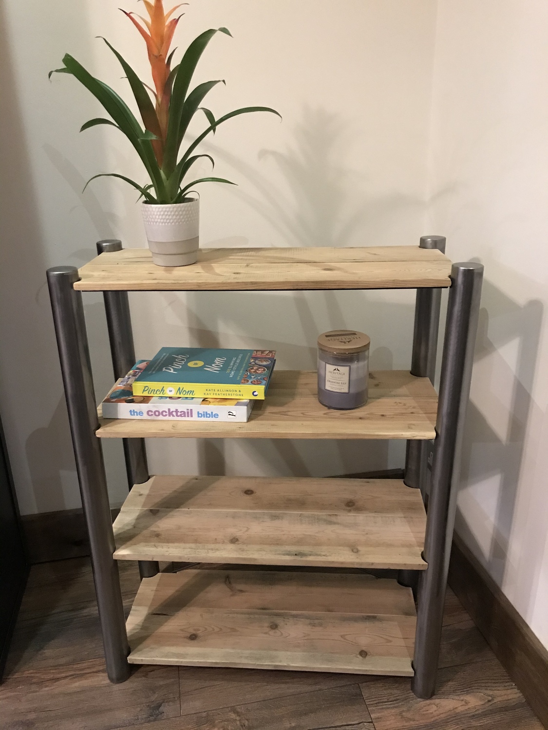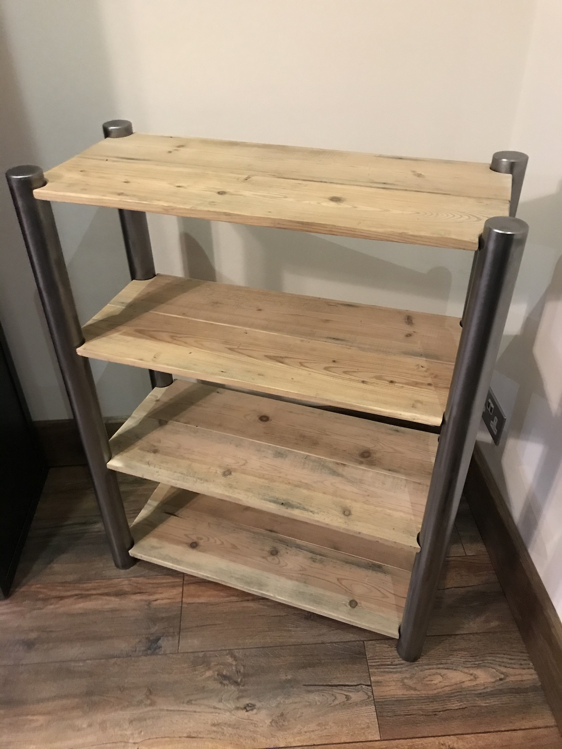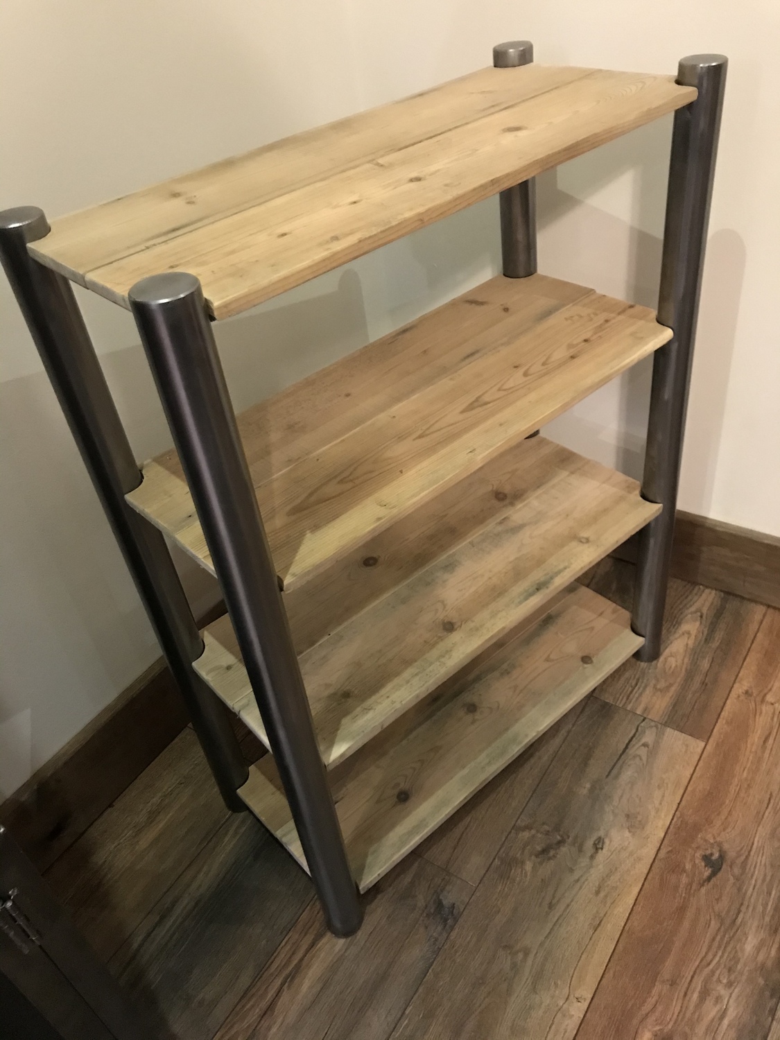 Stylish reclaimed wooden shelves with metal tubular design chunky legs.