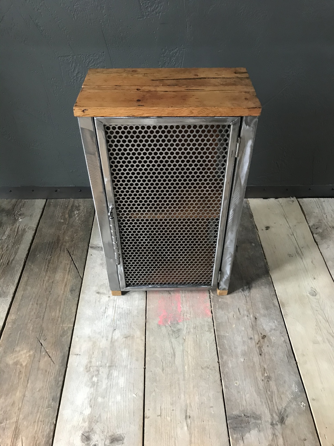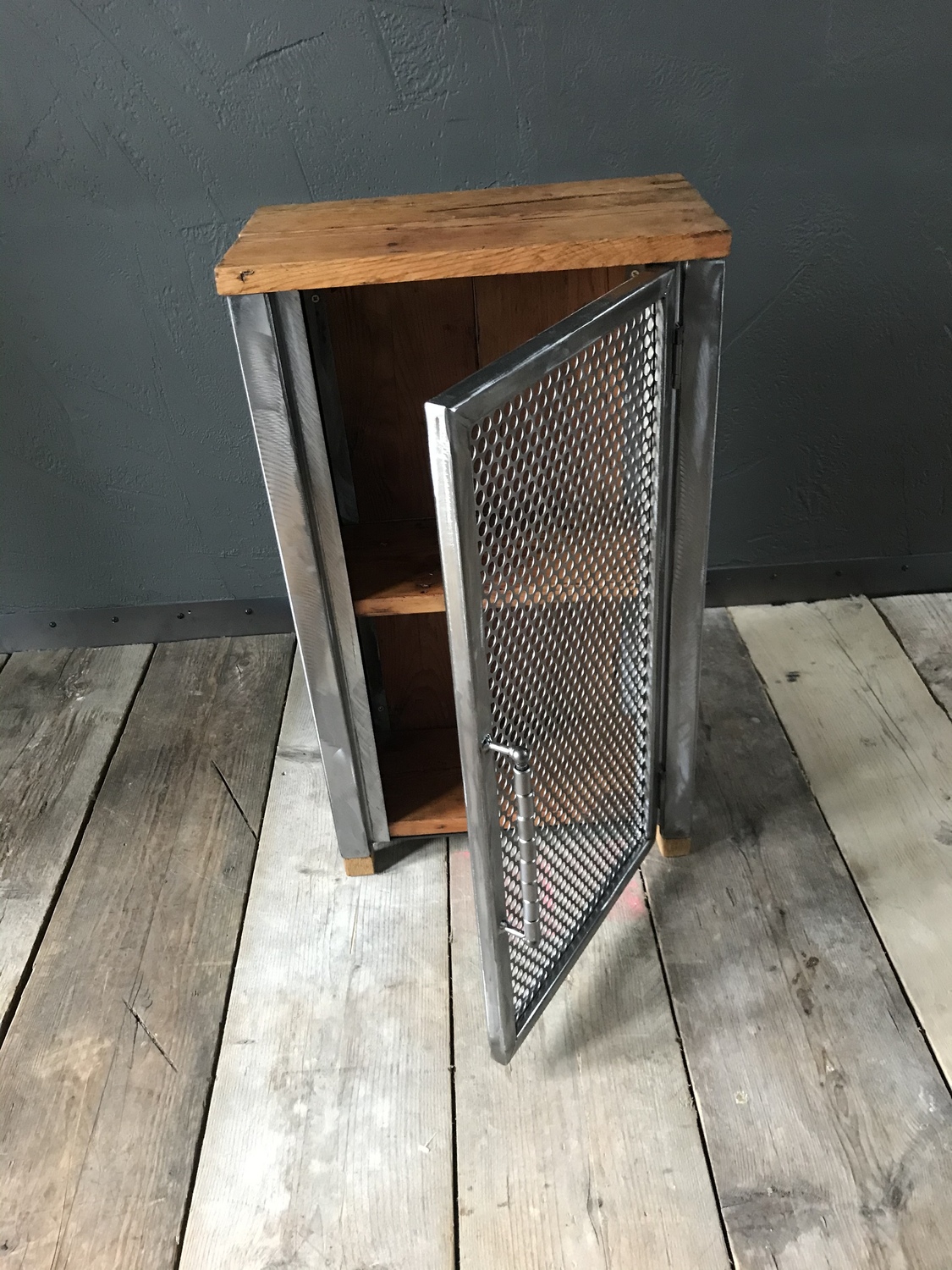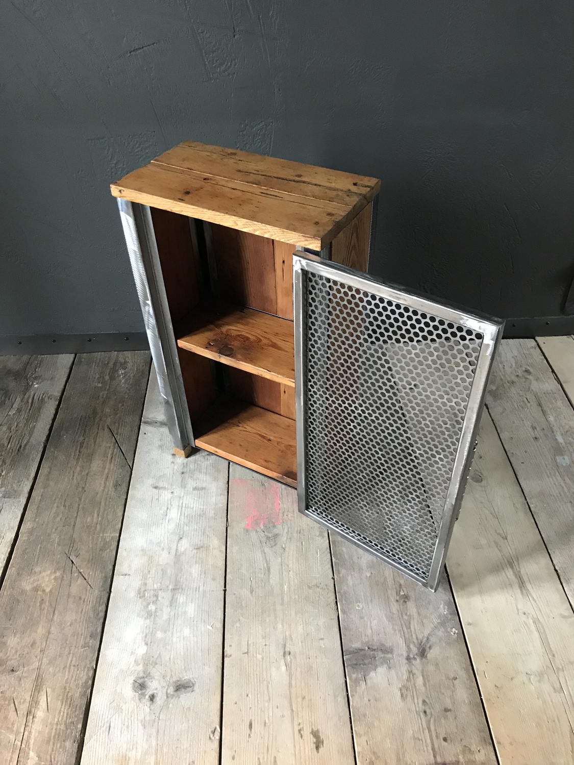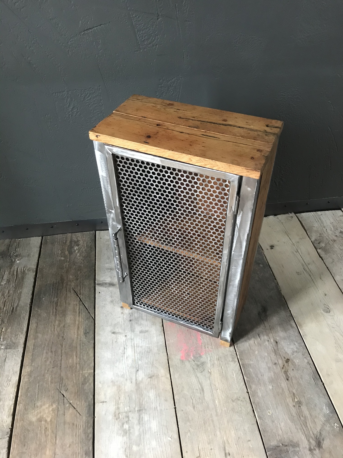 Bespoke handcrafted cupboard made using reclaimed wood and perforated metal mesh door. Handmade quirky metal door handle.