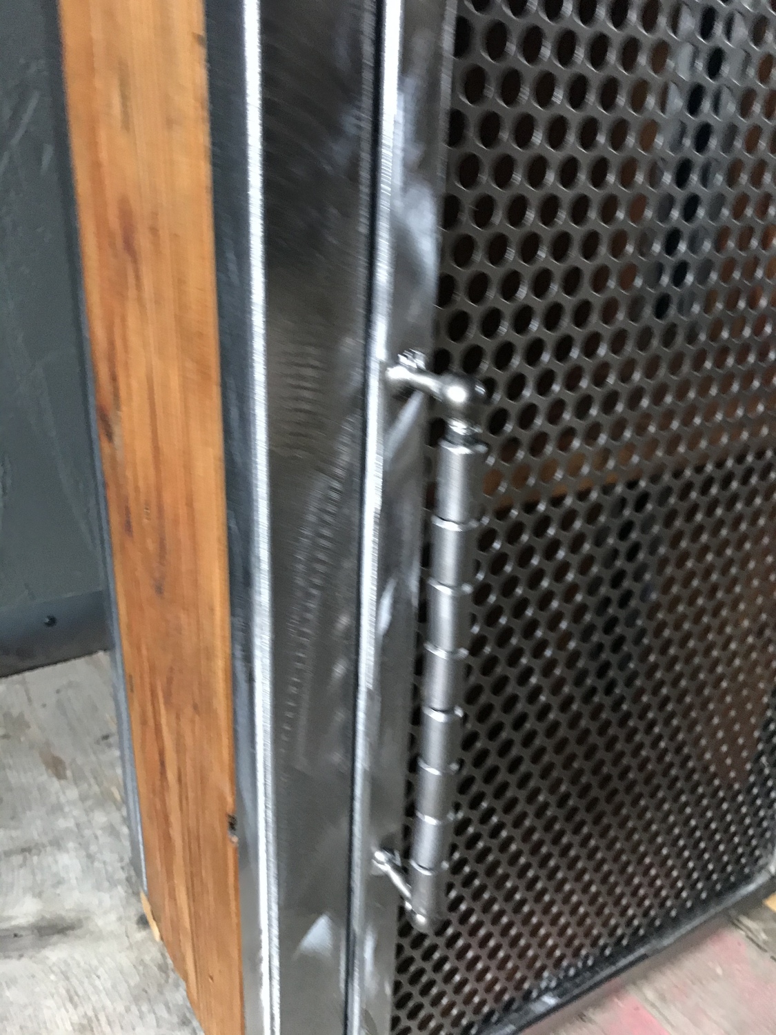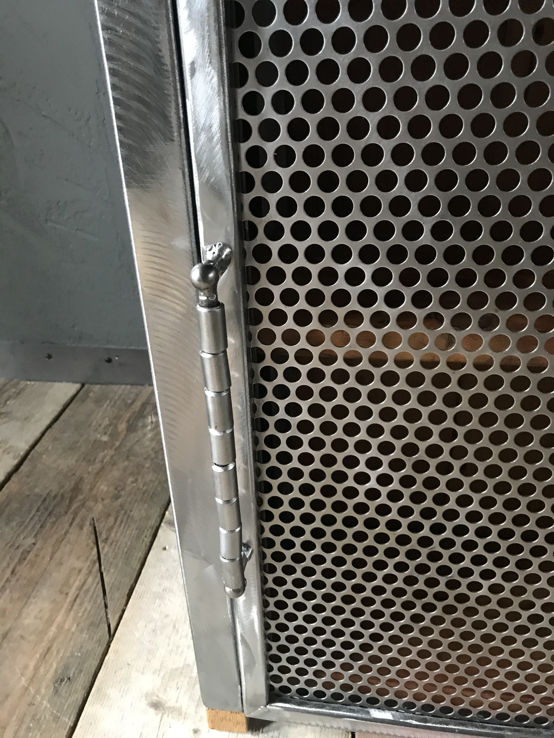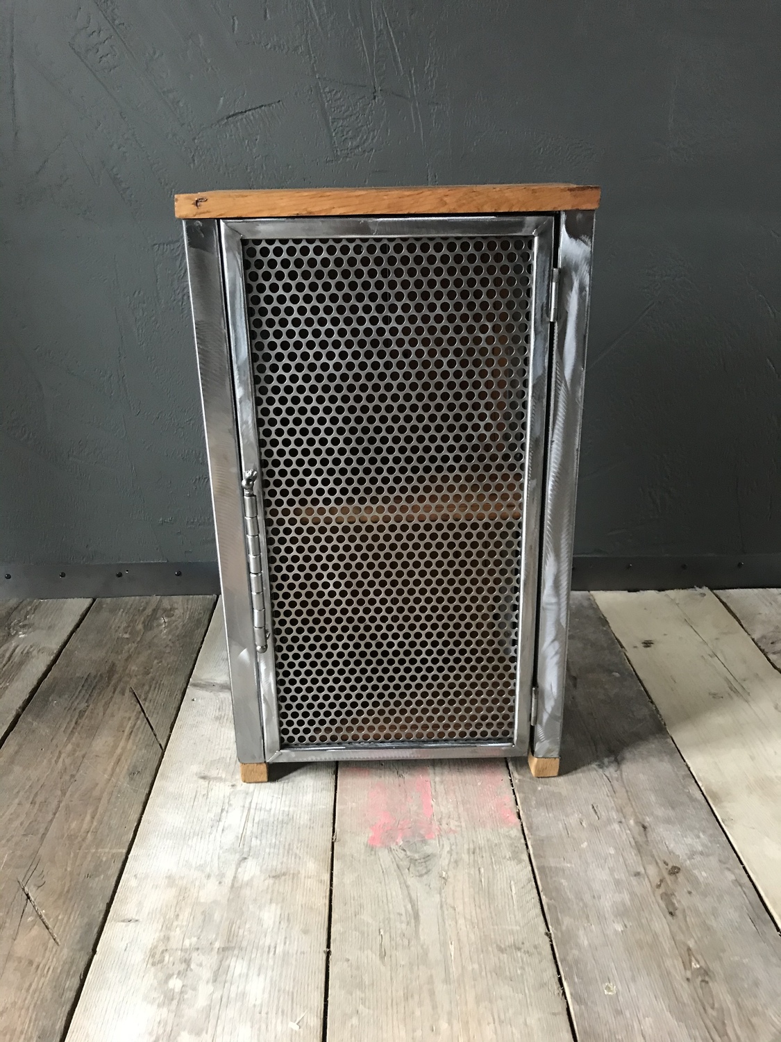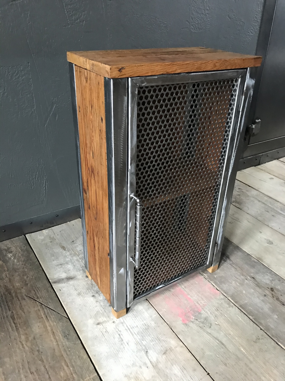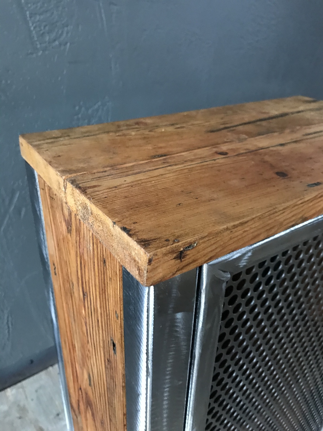 Bespoke handcrafted cupboard made using reclaimed wood and perforated metal mesh door. Handmade quirky metal door handle.
