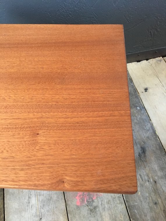 Table top was hardwood (Sapele - warm reddish colour) and the steel finished with lacquer.