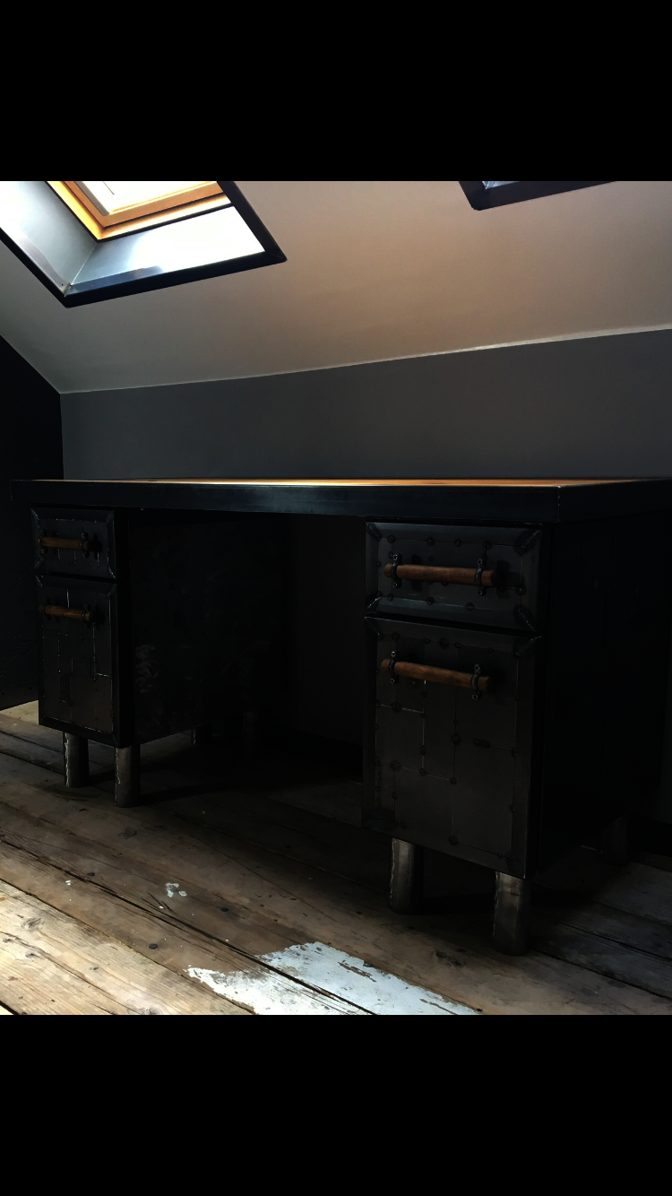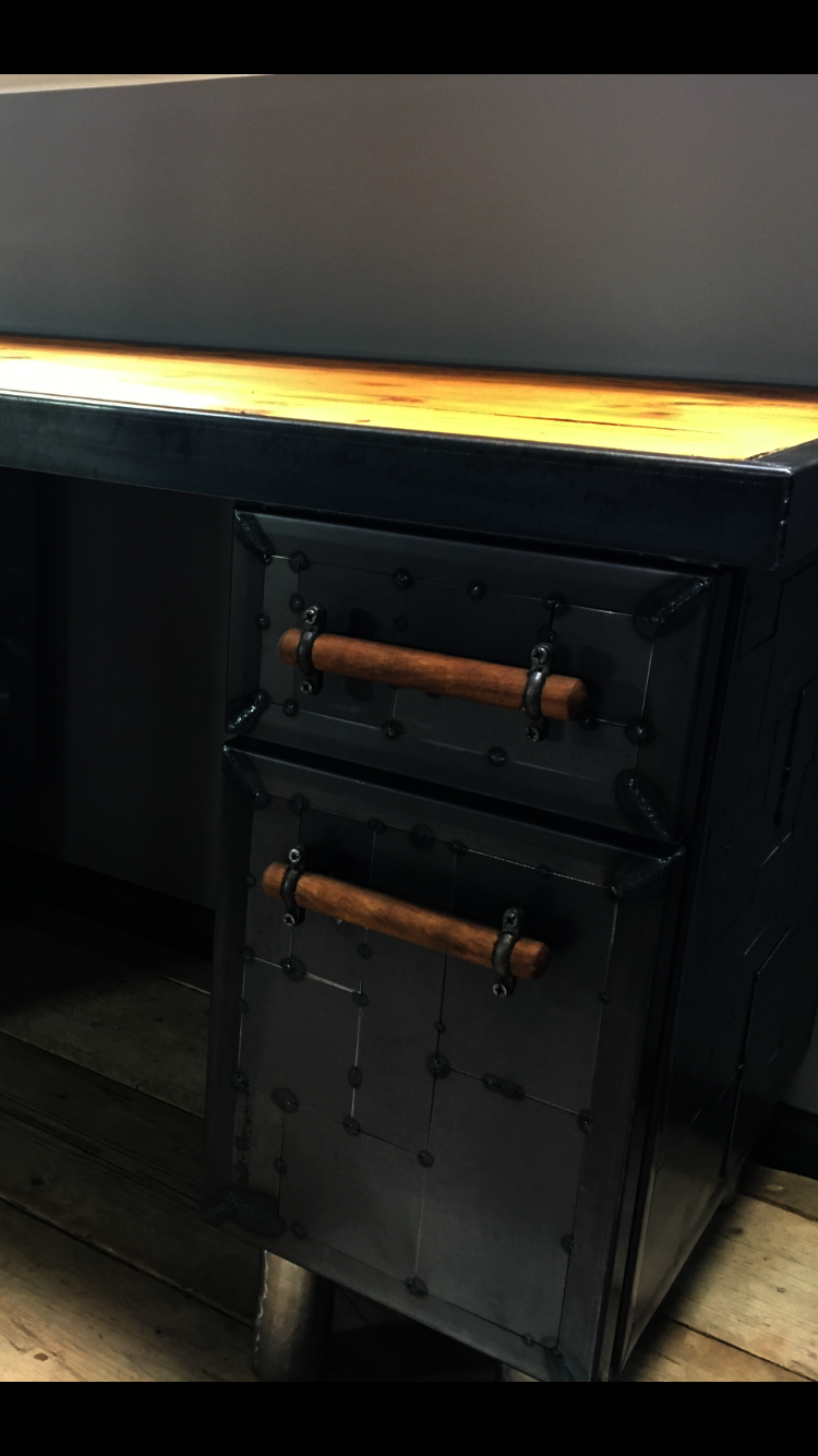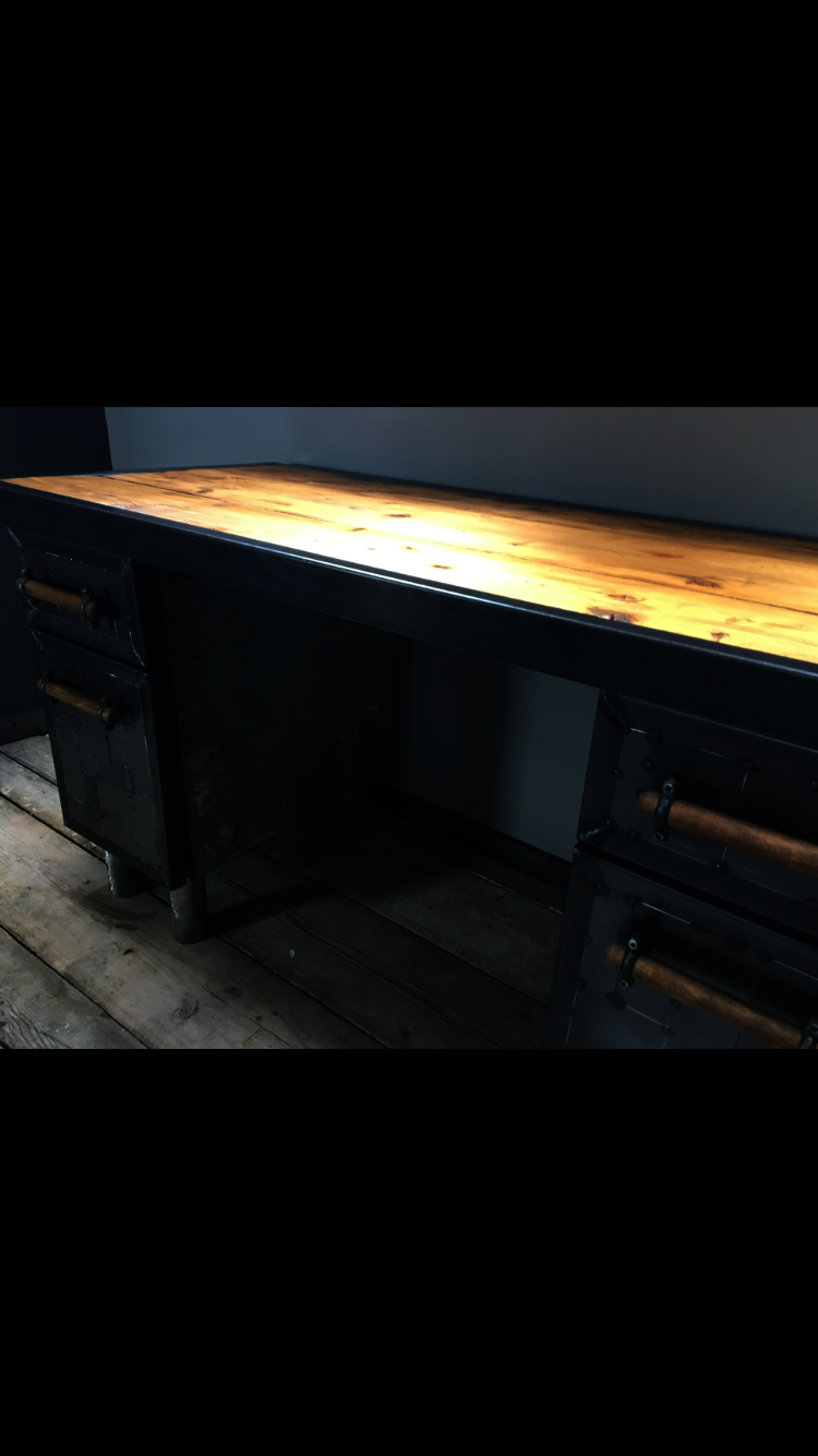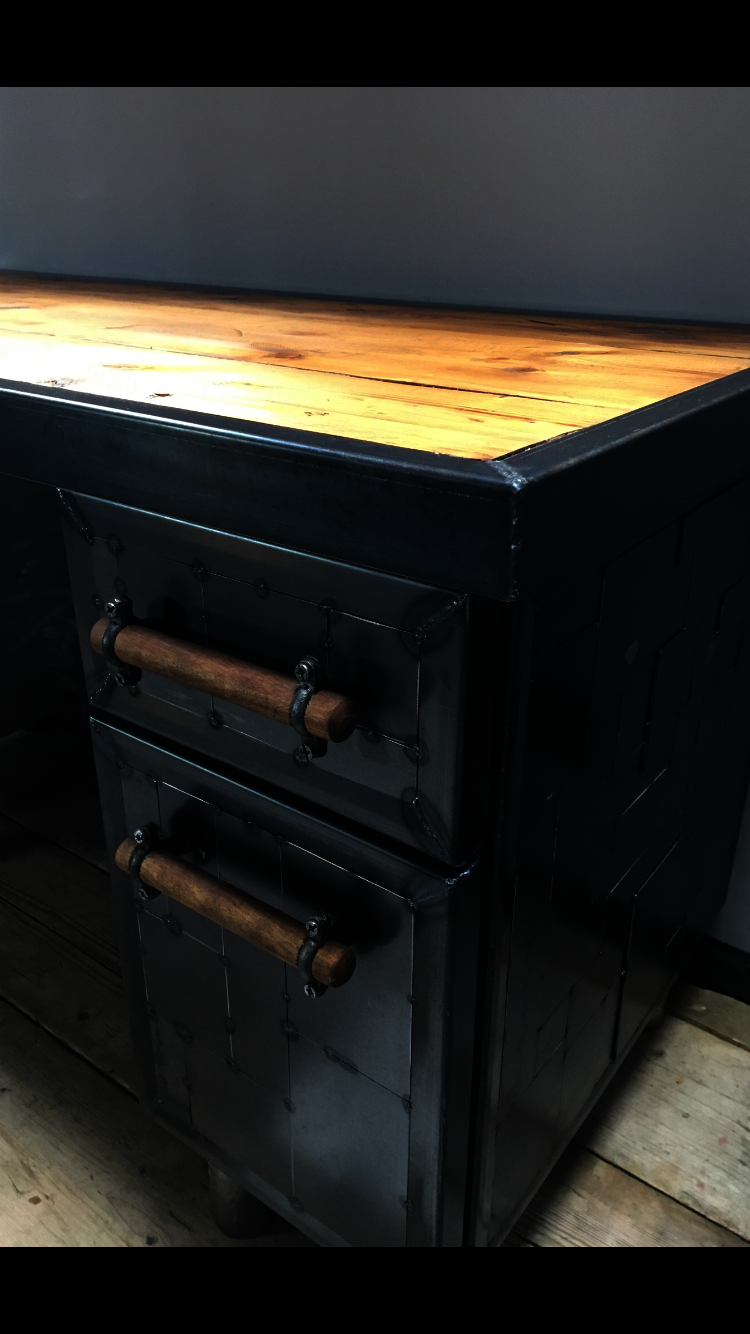 This desk top was made using reclaimed pine. The side drawers were upcycled metal drawer units, clad with a unique metal 'patchwork' style spot welding design and handmade wooden handles and metal feet. The desk top was also finished around the edges with a metal trim.