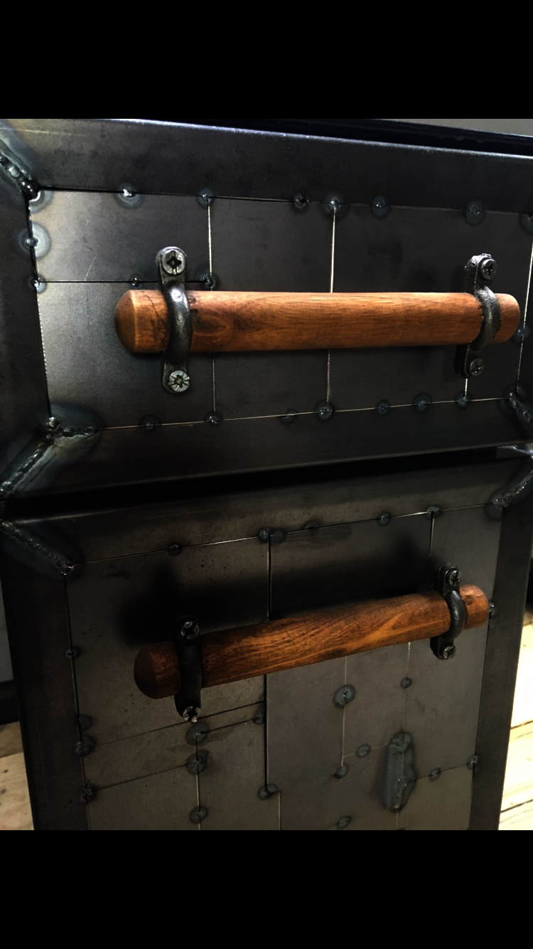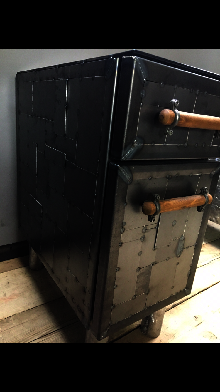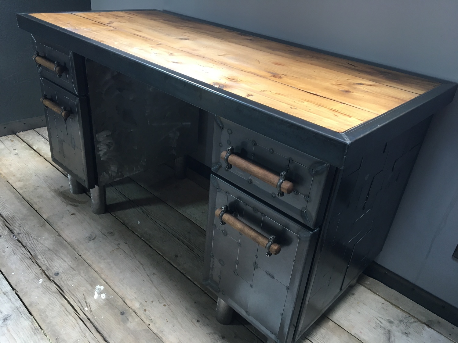 This desk top was made using reclaimed pine. The side drawers were upcycled metal drawer units, clad with a unique metal 'patchwork' style spot welding design and handmade wooden handles and metal feet. The desk top was also finished around the edges with a metal trim.