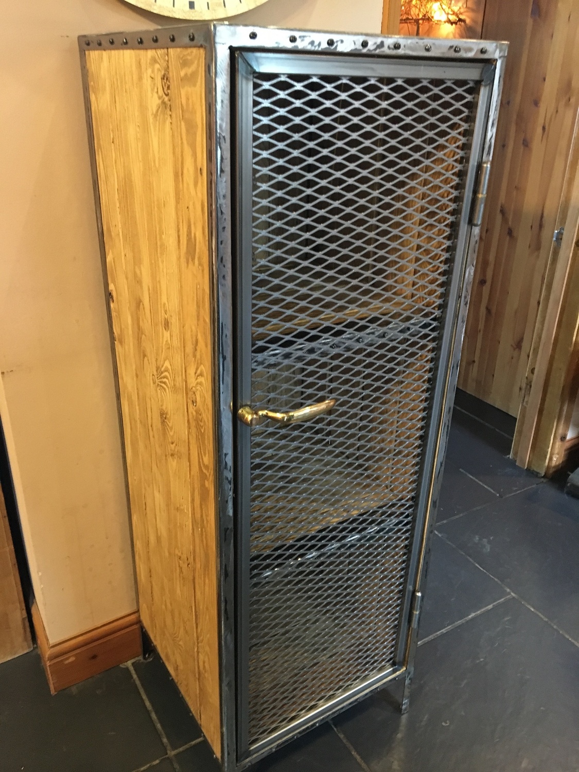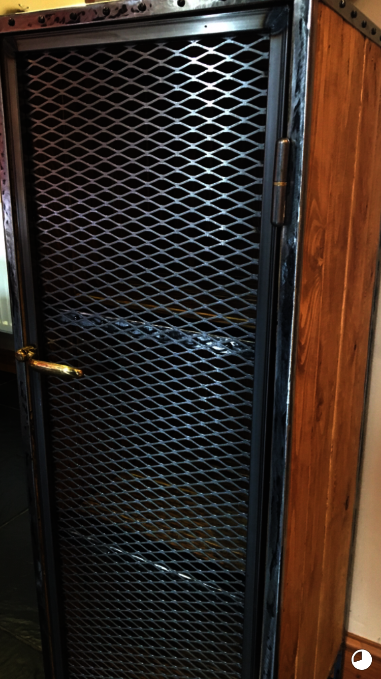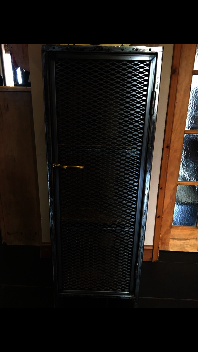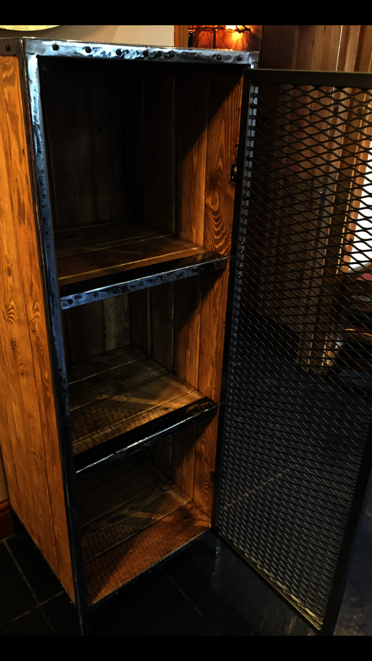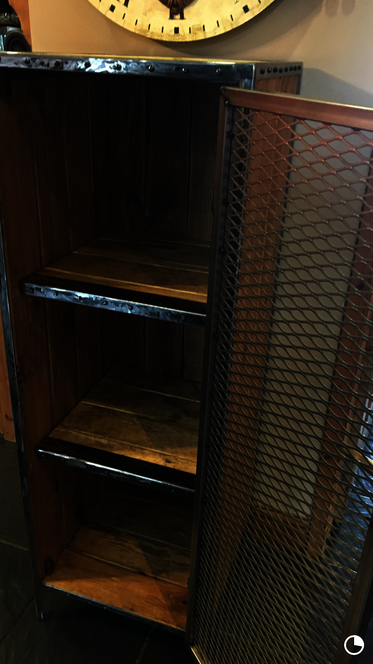 This cupboard was handcrafted from scratch using reclaimed wood. It had two shelves inside, each with a decorative metal trim. The door was made with metal expand mesh. The handle was antique/ reclaimed and solid brass.