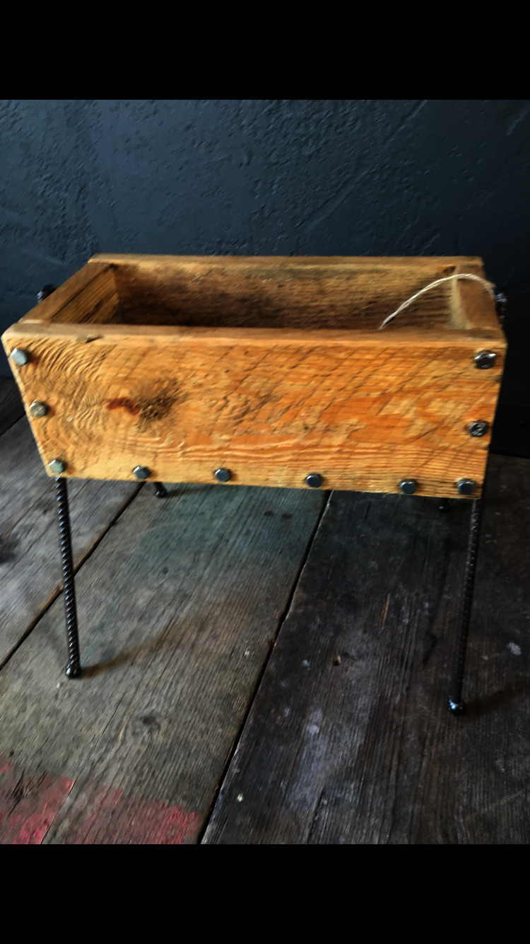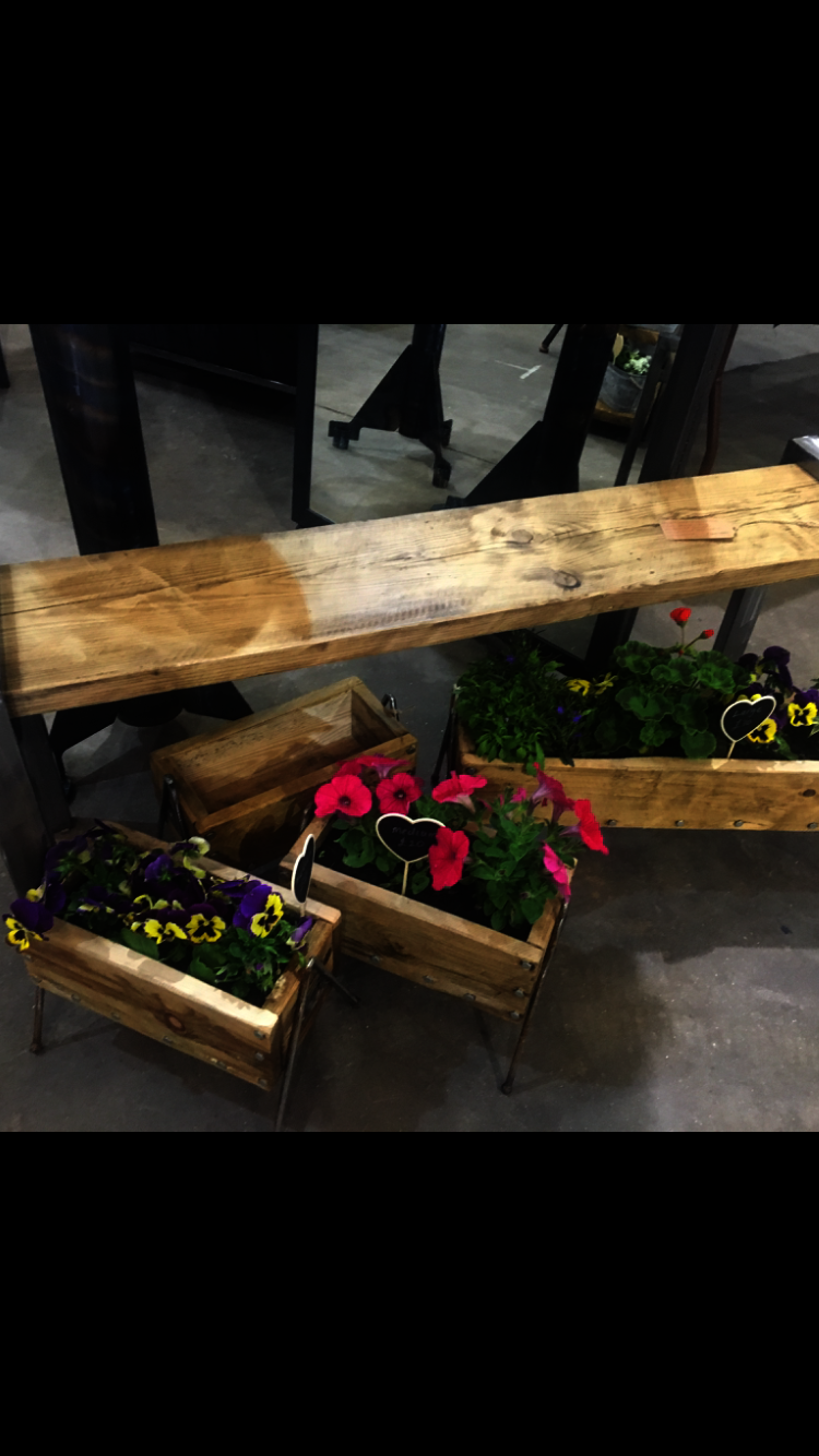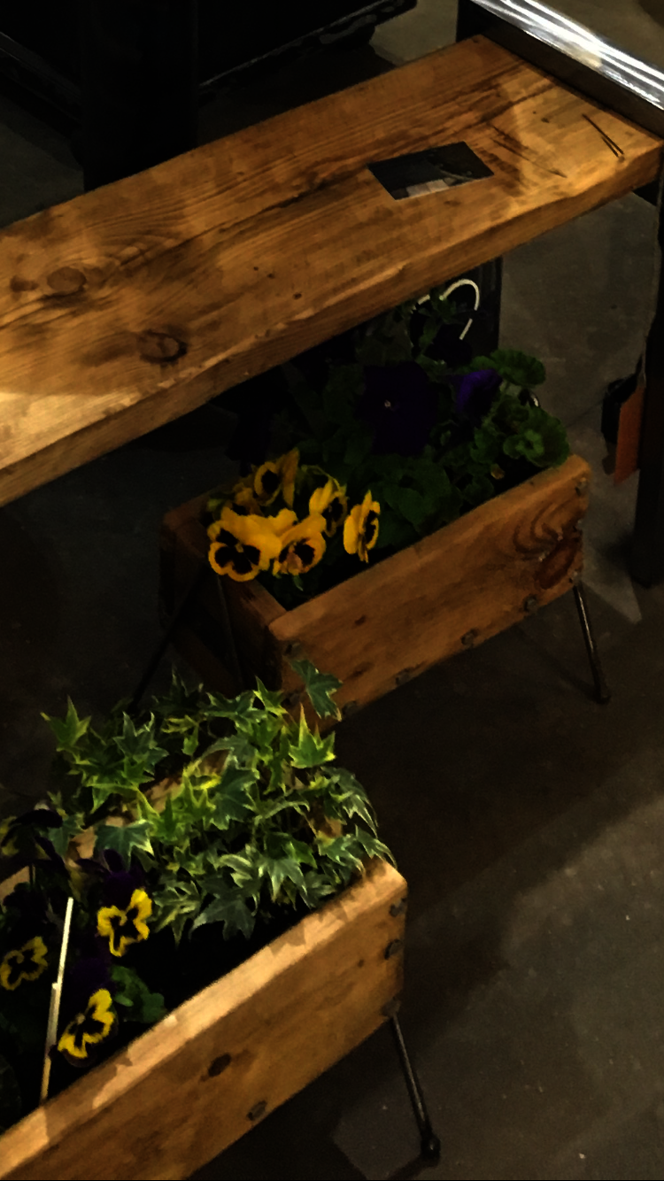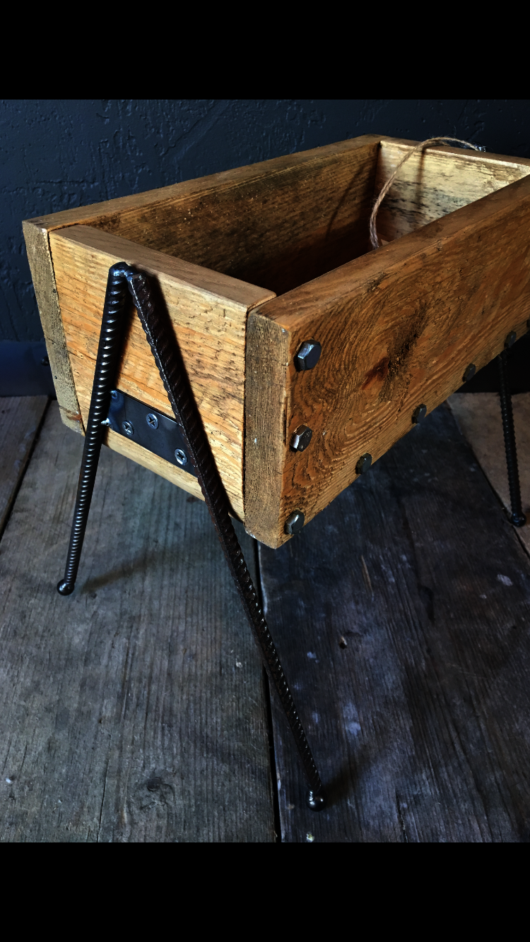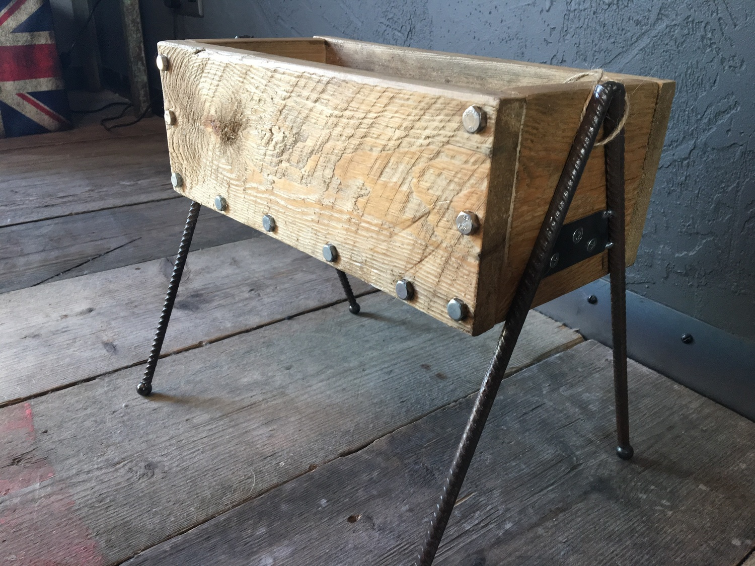 This industrial style planter was made using reclaimed pallet wood timber and reed bar legs with decorative bolts around the edges, to give a unique industrial look.