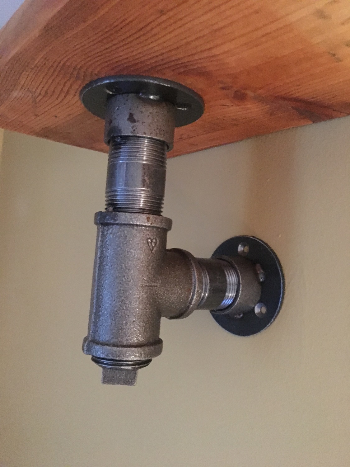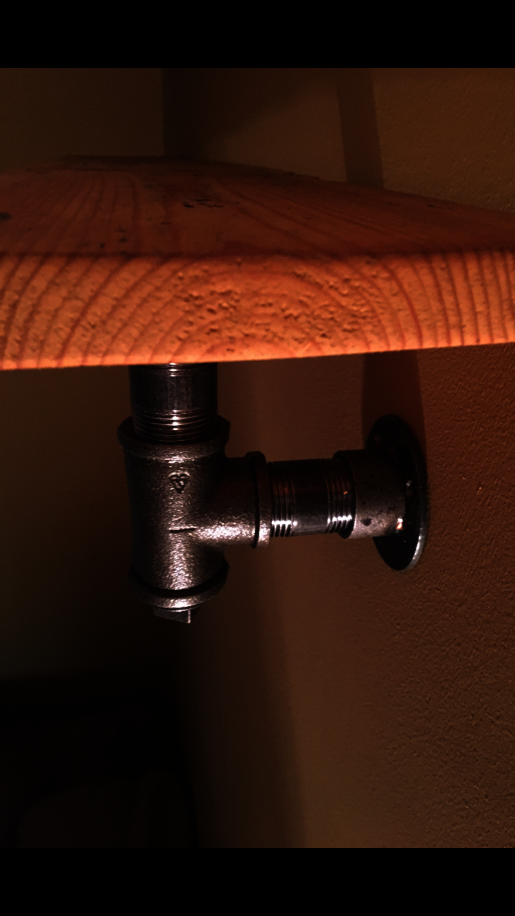 Brackets made from black metal pipe fittings and mild steel backing plates. Lacquered.