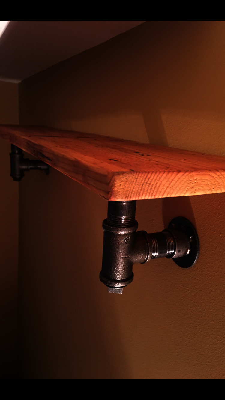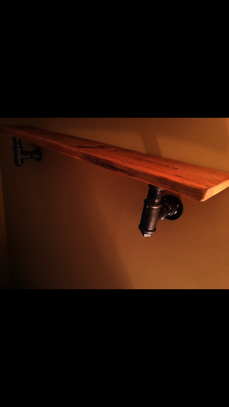 Reclaimed rustic wood shelf with industrial pipe brackets
