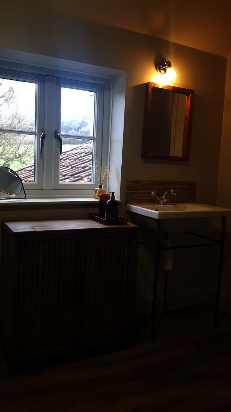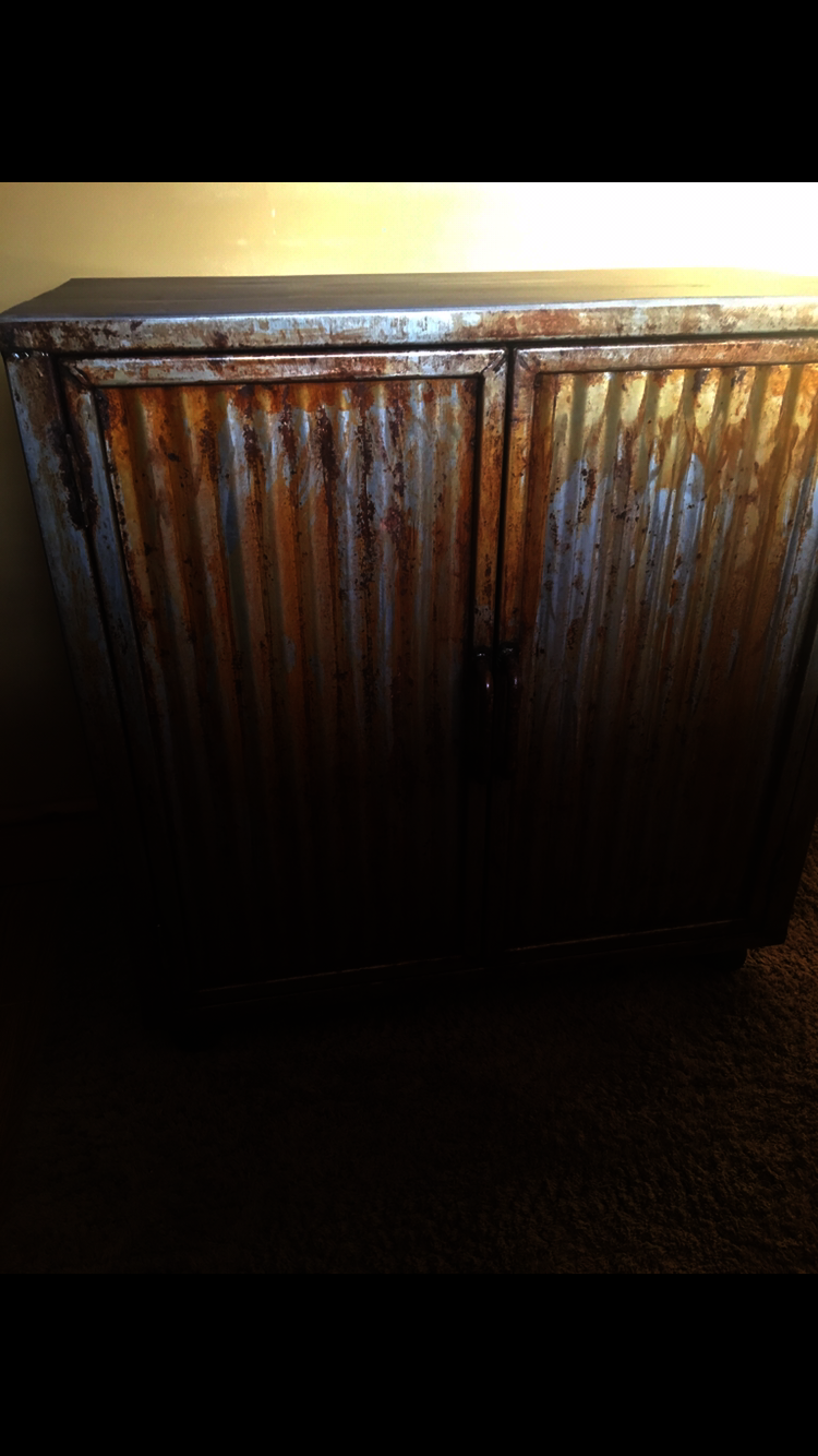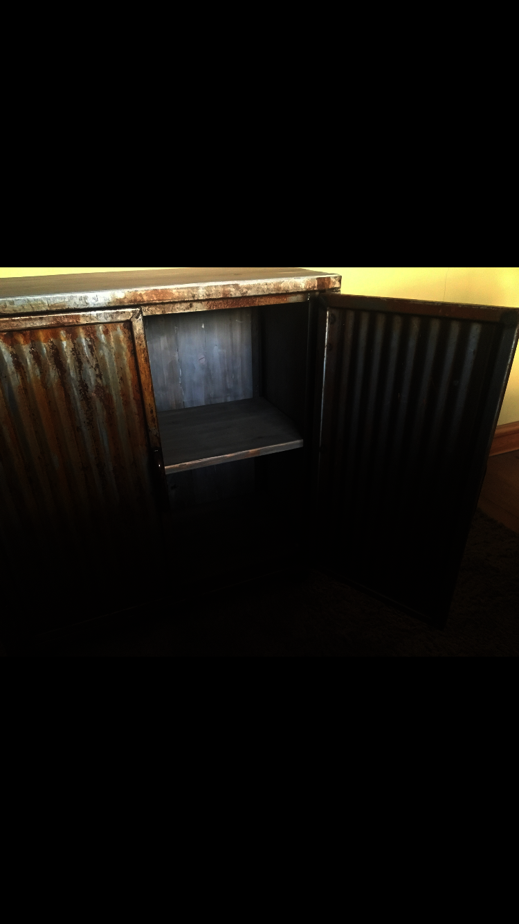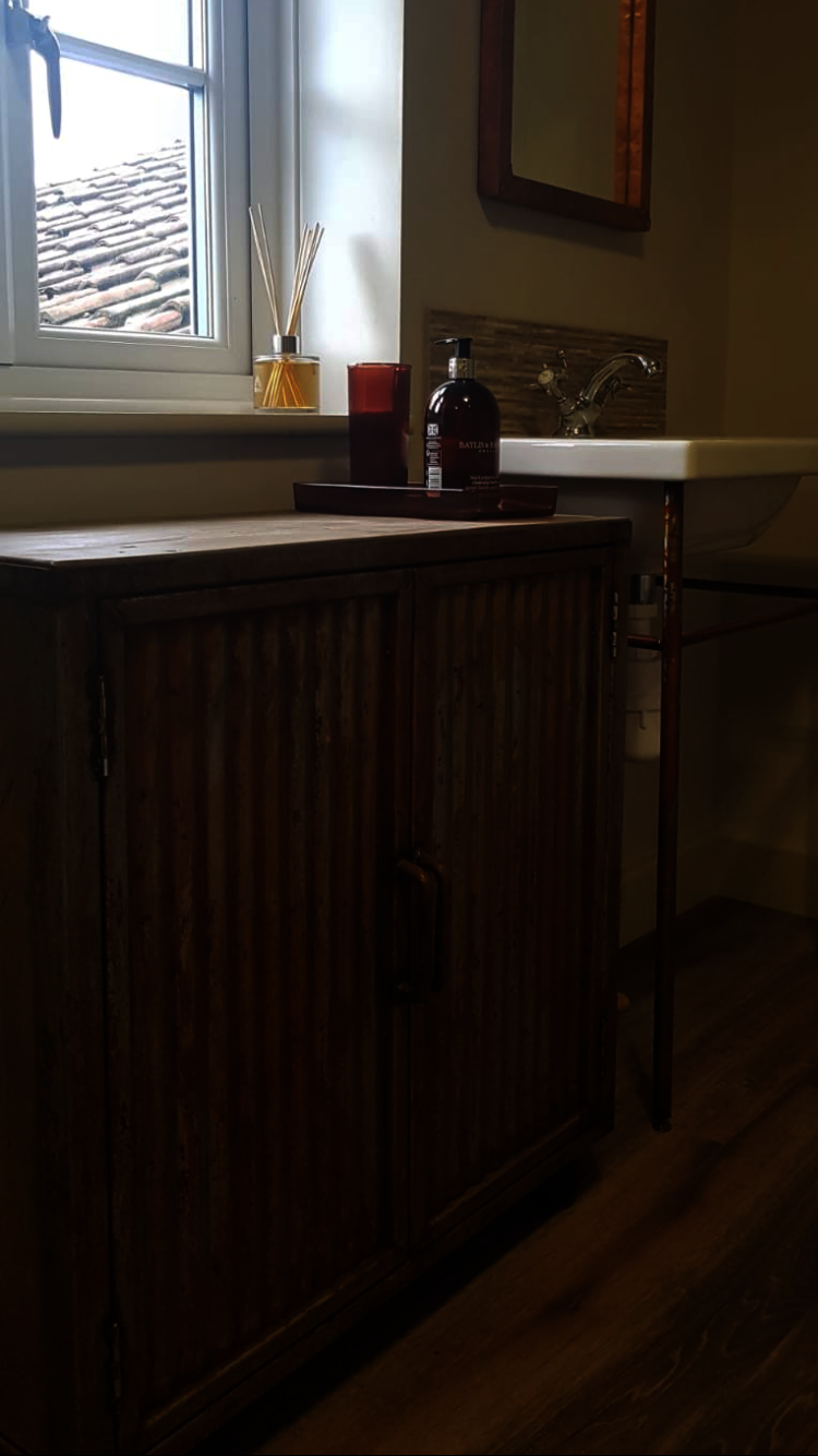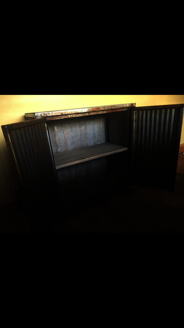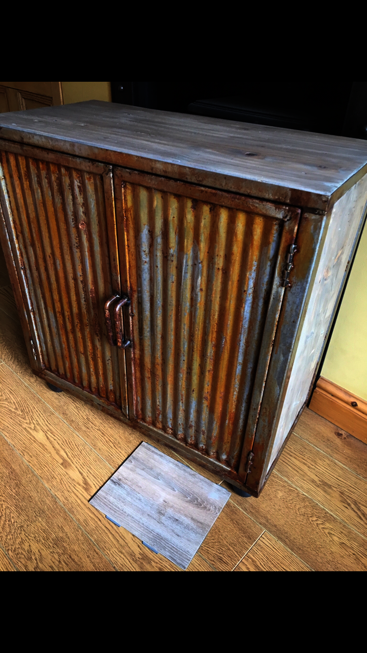 This cupboard was handcrafted from scratch. The doors were made with handmade corrugated metal and deliberately lightly rusted and then sealed using lacquer. The wood which was used was reclaimed, and coloured lime oak to match the customer's bathroom floor. The handmade metal framework brought it all together.