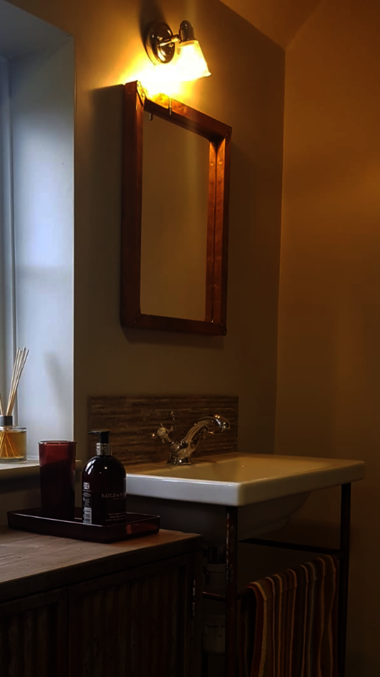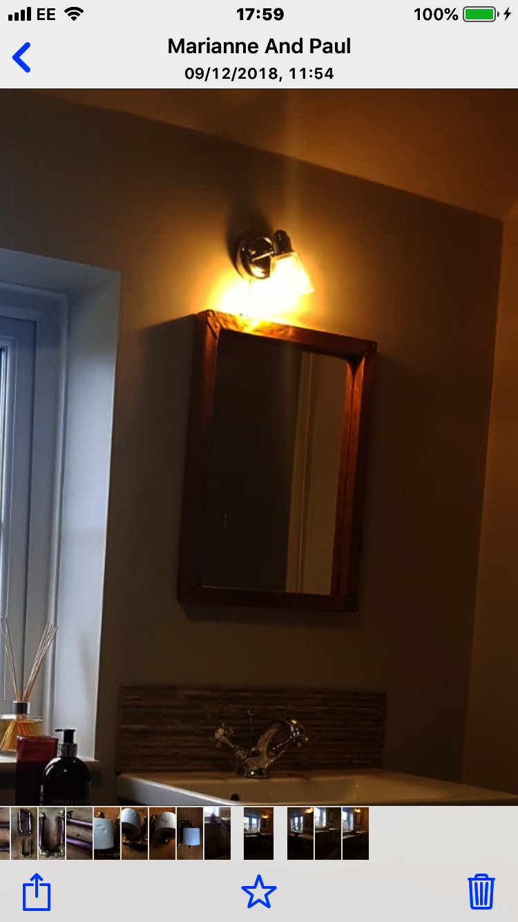 This copper mirror was the final piece we made for the customers' unique and stylish bathroom, as shown in the other portfolio listings. The customers requested a copper framed mirror and left the design to us. The copper matched the rust in the other pieces of furniture in their bathroom and the uneven texture of the frame matched the rest of the bathroom pieces. The customers were pleased with the end result and it was the perfect finishing touch for their amazing bathroom.