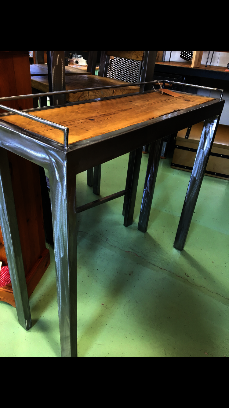 Rustic reclaimed wooden top (old used scaffold board full of character), sanded and waxed, with handmade tall shiny scuffed metal legs. A lovely rail around the top to complete the look.