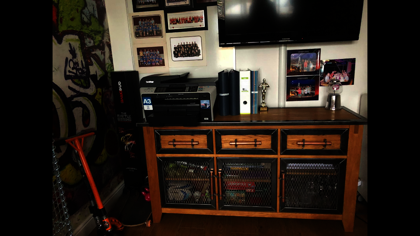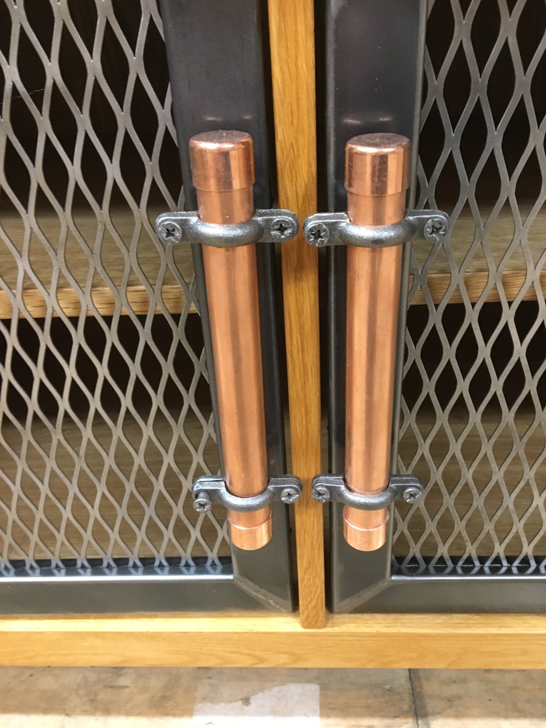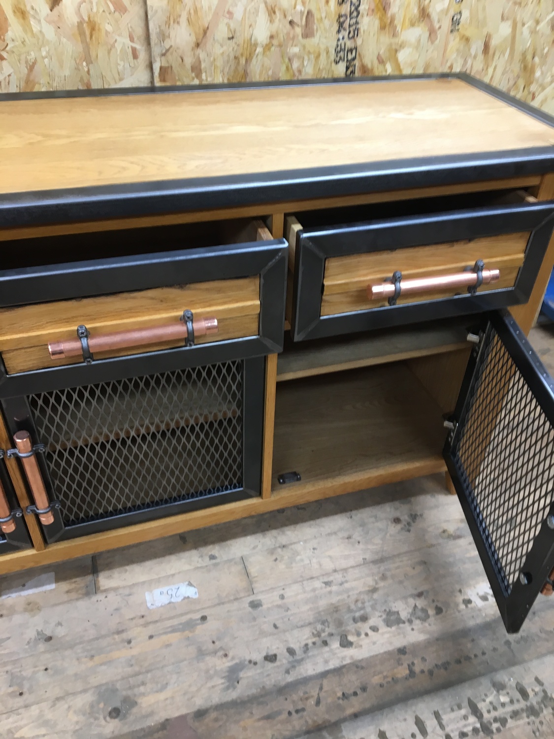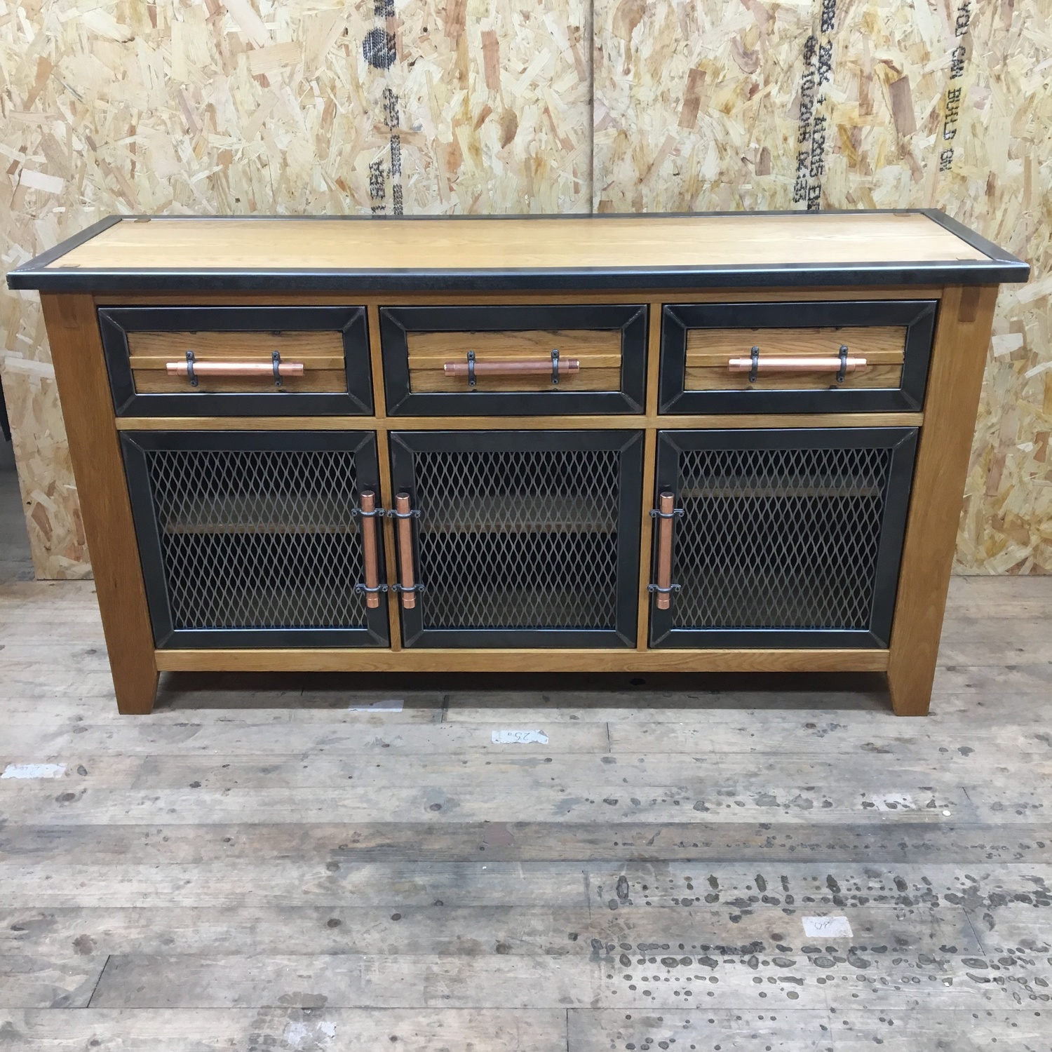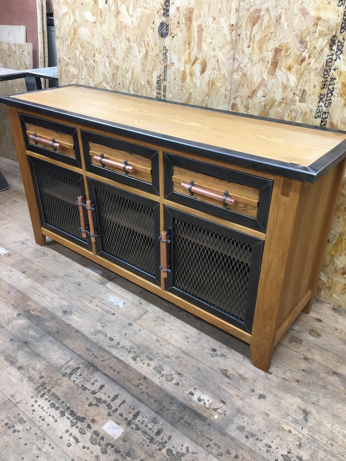 We took on a commission to upcycle an oak sideboard (see the 'before' picture in the images). We met with the customers to discuss their requirements to suit their decor and between us we came up some industrial style alterations - copper handles, mesh metal doors and a metal frame surround - to create this industrial-steam looking sideboard to suit their interesting themed room - see images. A one-off unique project.
