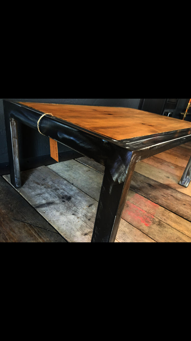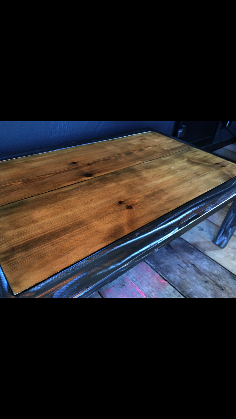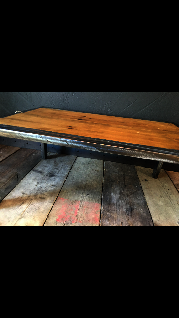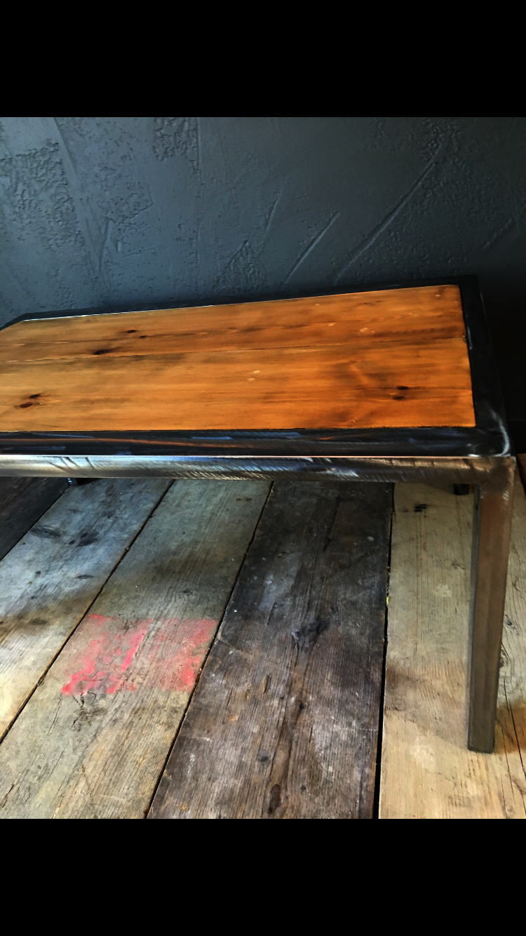 Handmade and unique on-trend piece of furniture. Lacquered shiny scuffed steel finish on the metal. Reclaimed wood, with wax finish, aged with lots of character - marks, scuffs, cracks and dents to add to the charm and rustic feel of this type of furniture. Made with skill, experience and passion. Heavy duty and long-lasting.