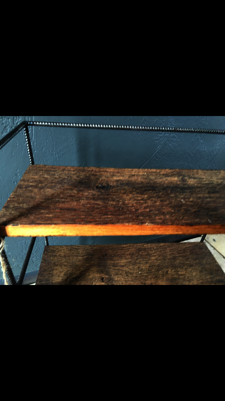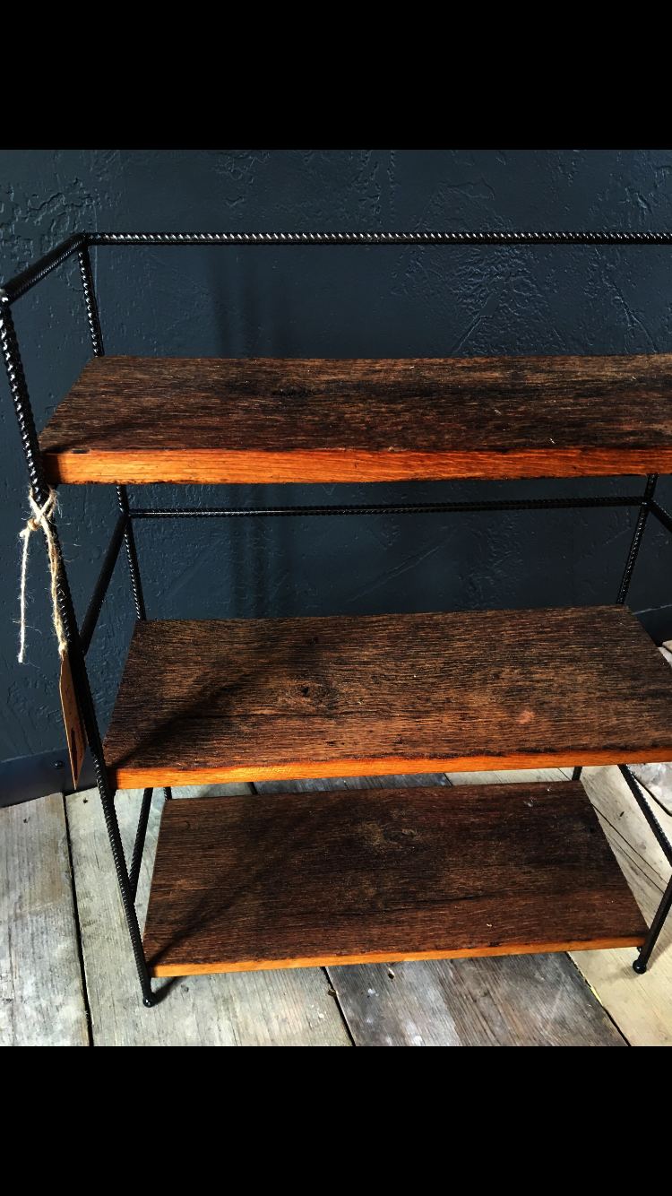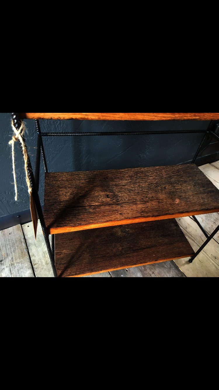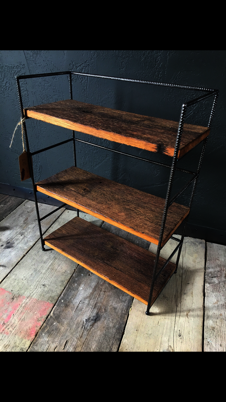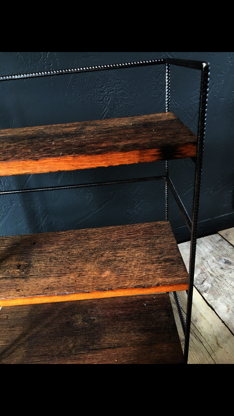 Solid oak, rustic shelves with polished reed bar steel frame with welded ball bearing feet.