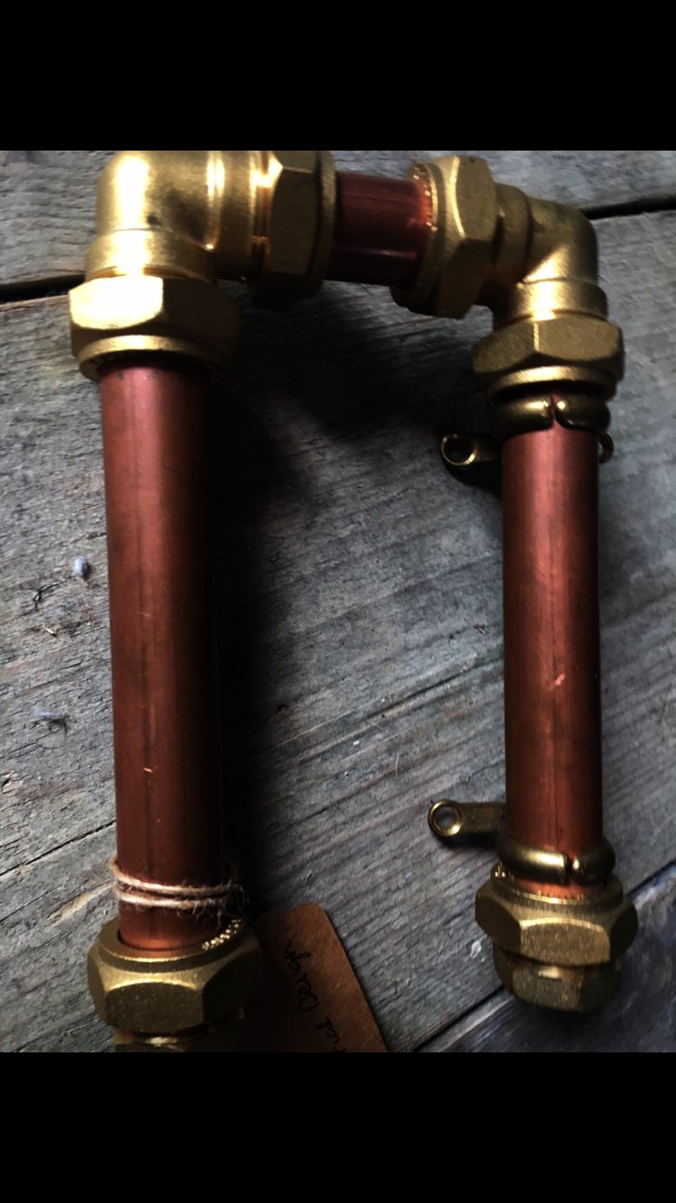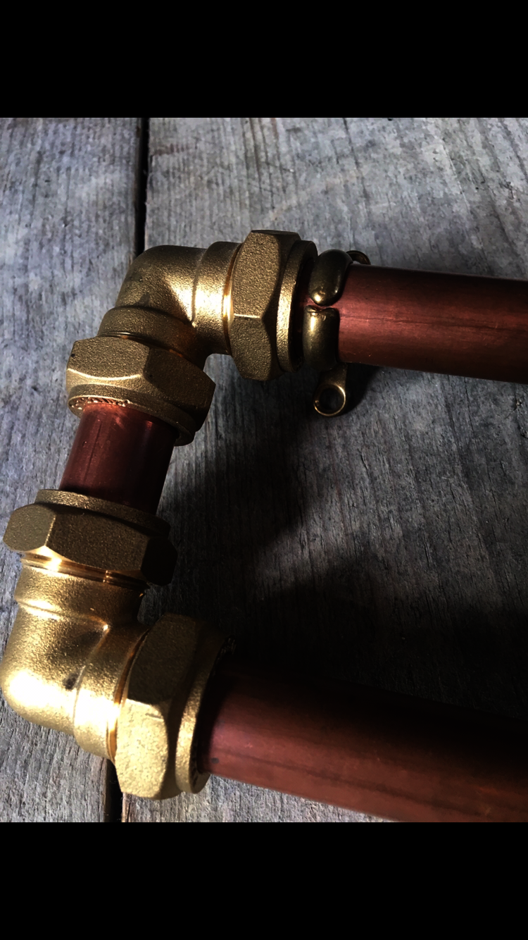 Industrial style copper pipe toilet roll/towel holder with brass fixtures and fittings.
