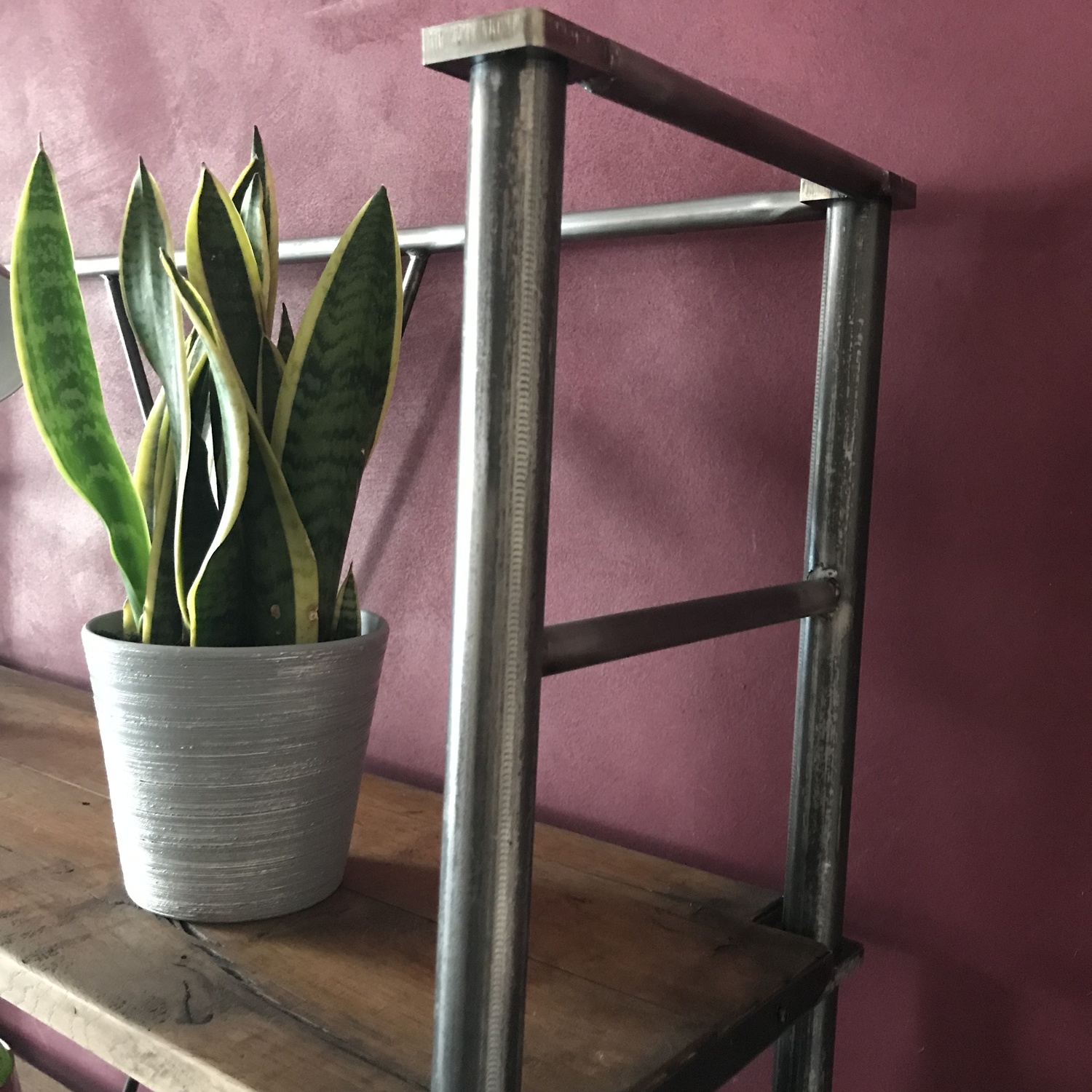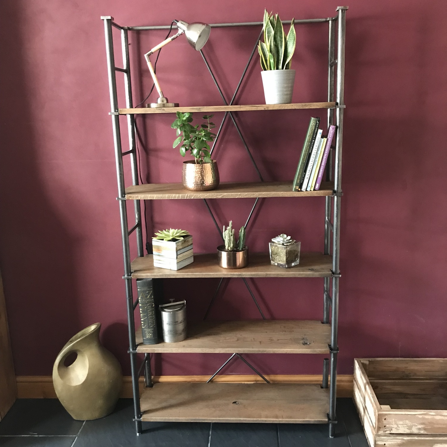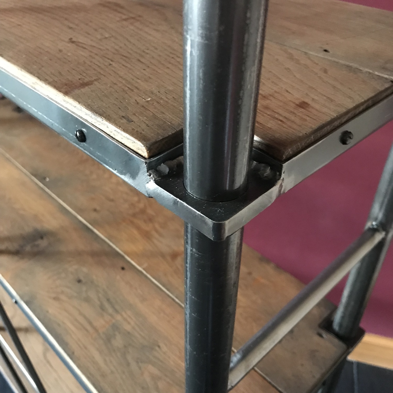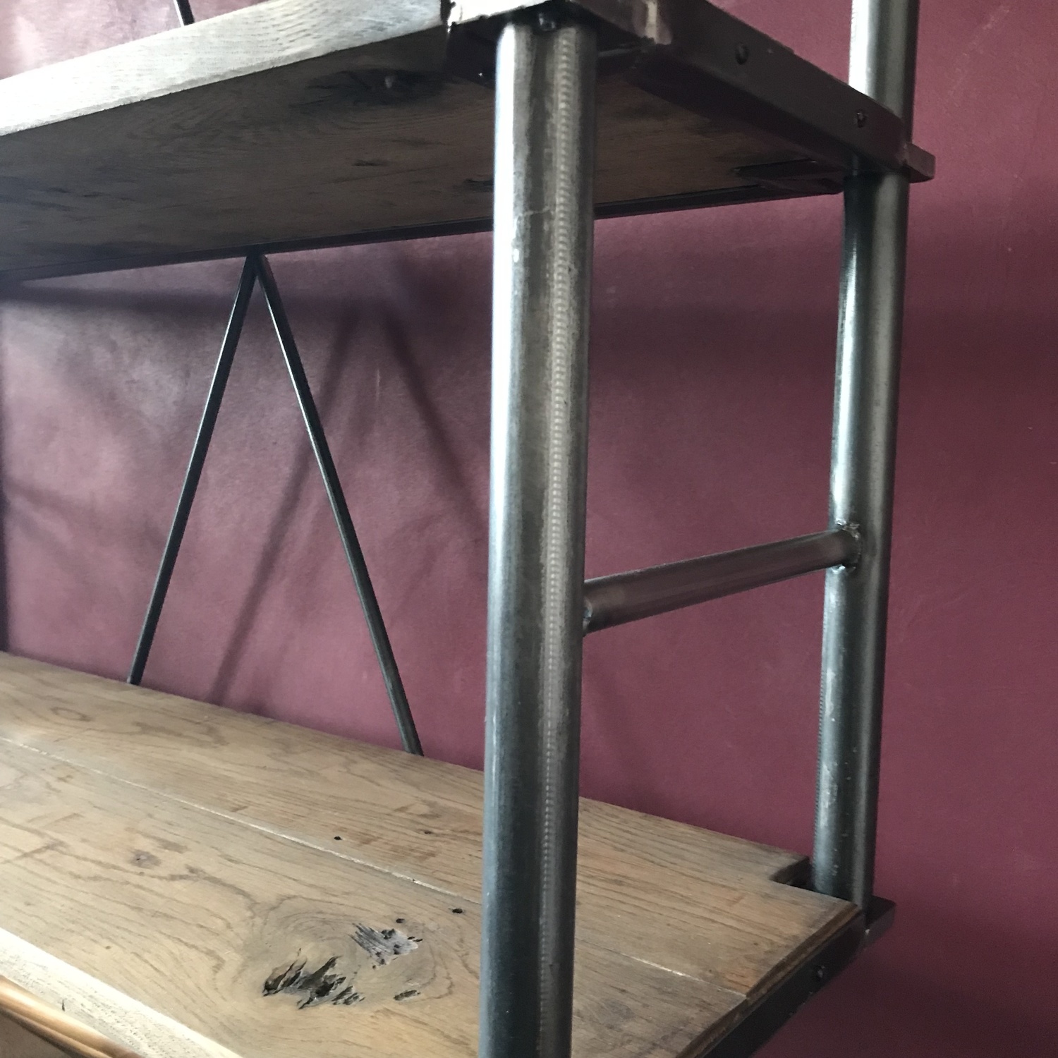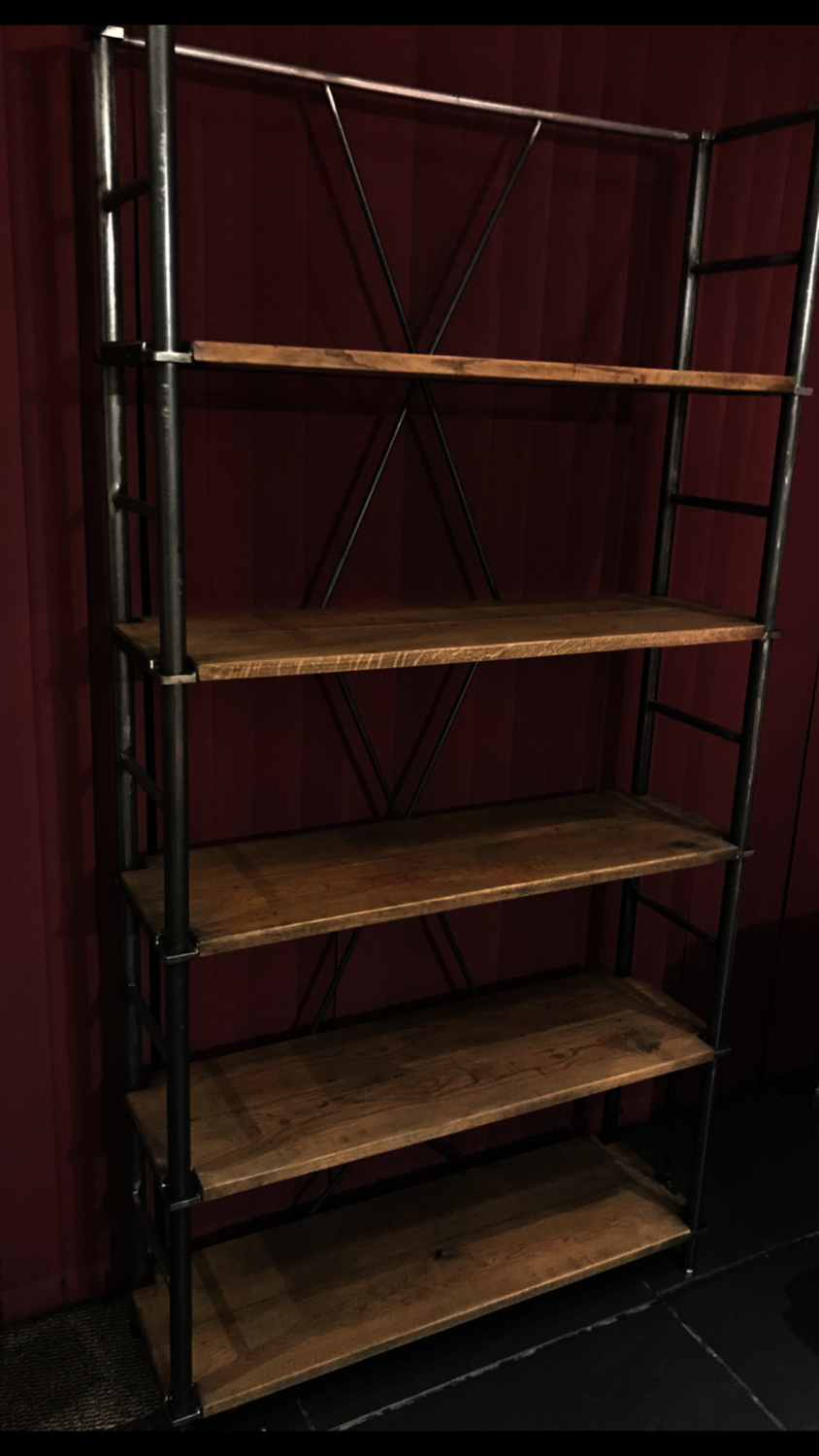 The wood used was reclaimed oak and it was stained to match their existing furniture. The frame was black tubular steel with flat sheet metal fabrication to hold the oak shelves in position.