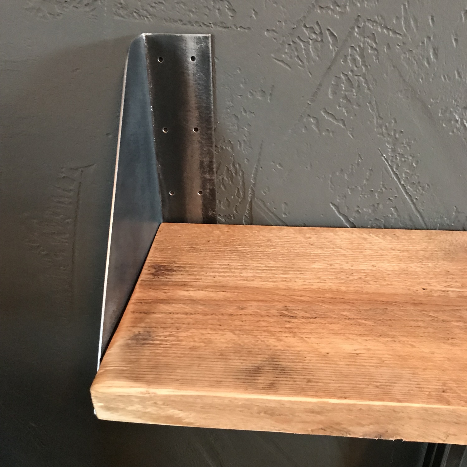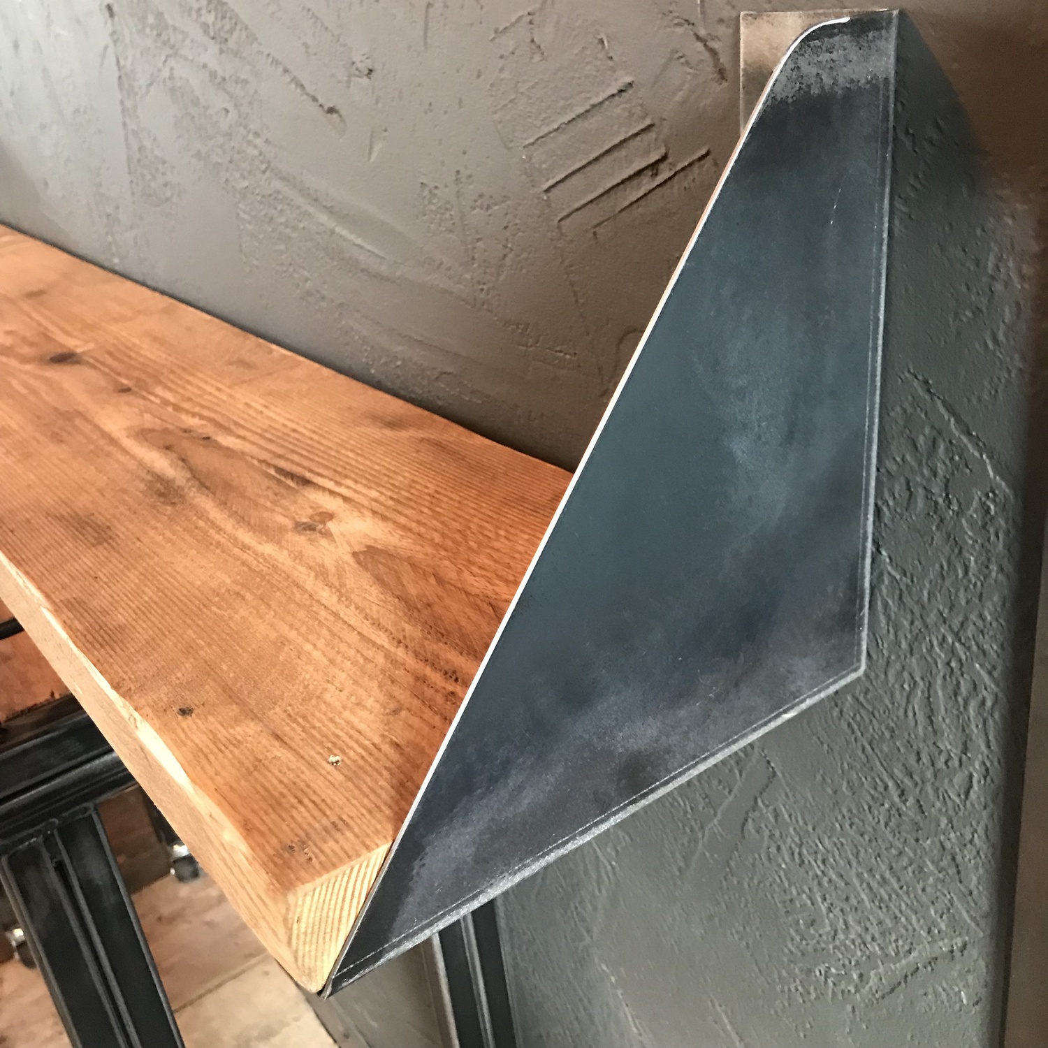 The customer commissioned us to make bespoke handmade industrial style metal brackets to go with these shelves and was very happy with the result!