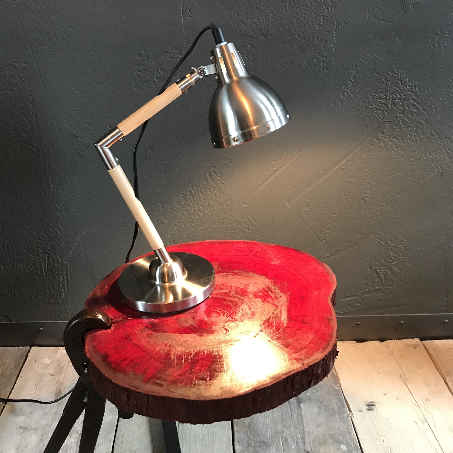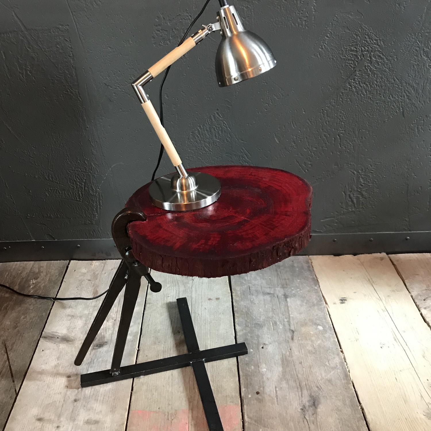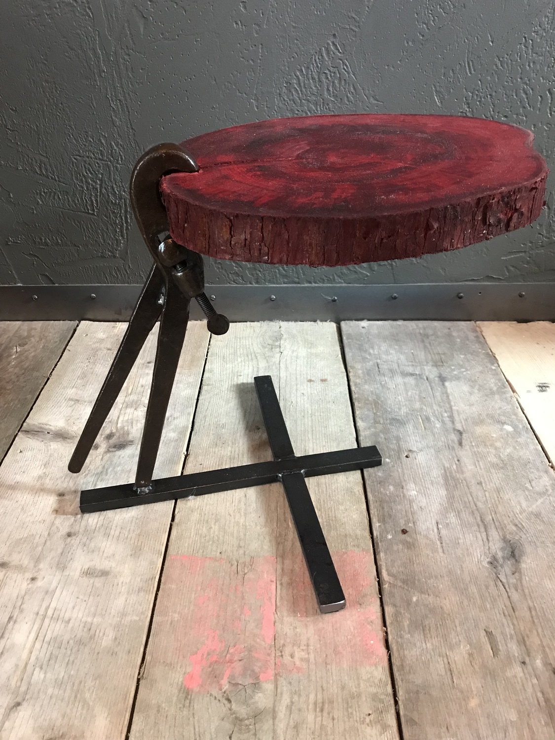 We used a piece of sliced tree trunk for the top, which we stained bright red!
