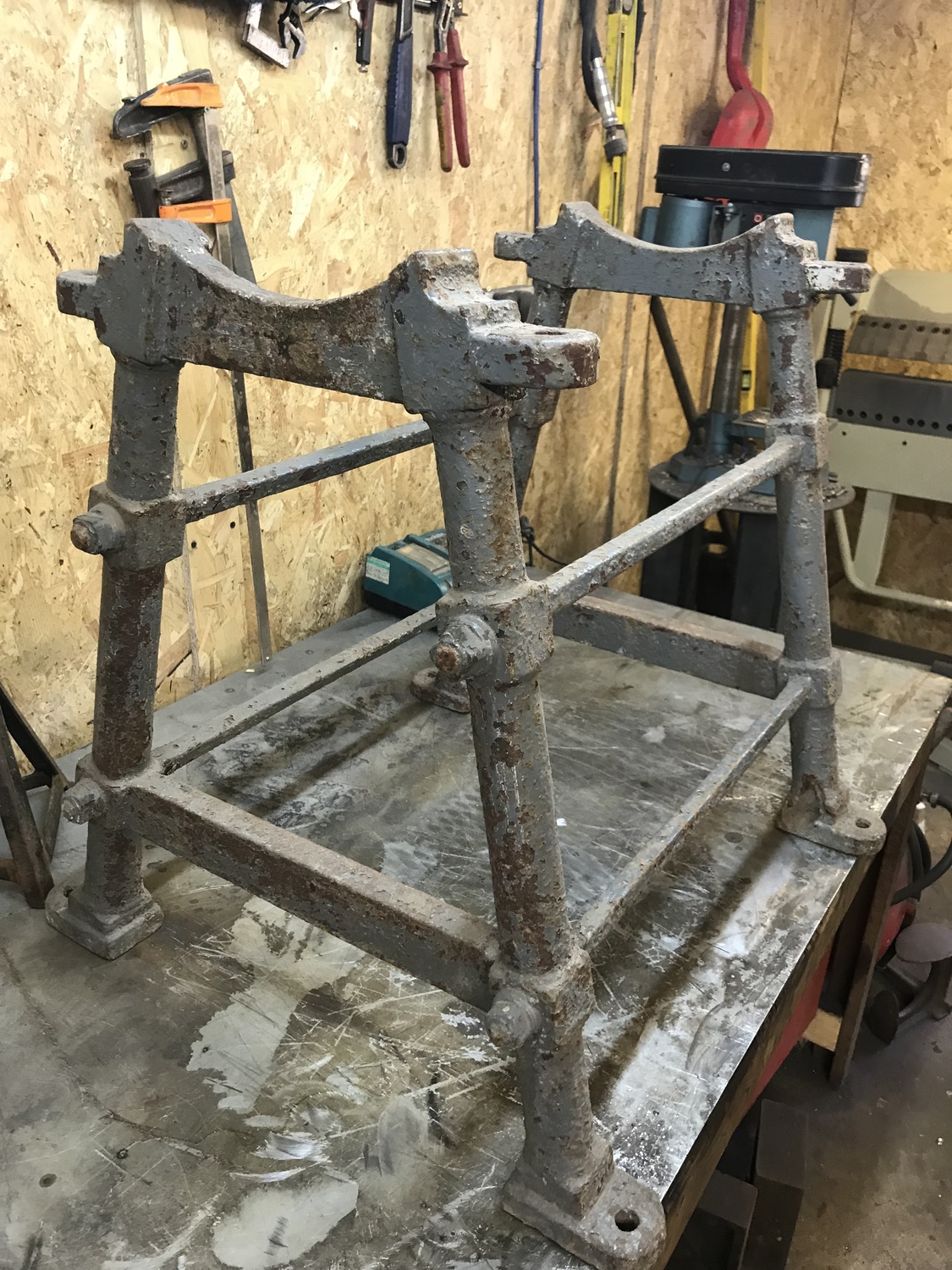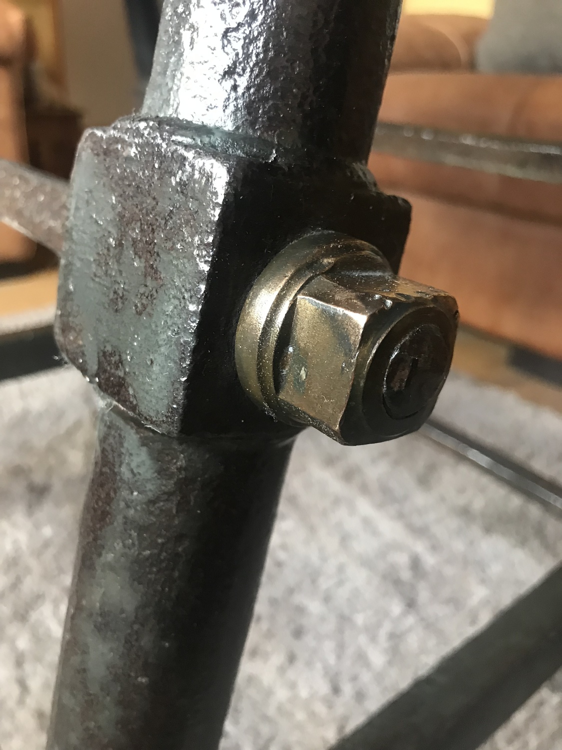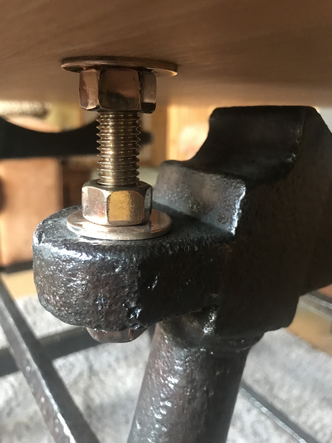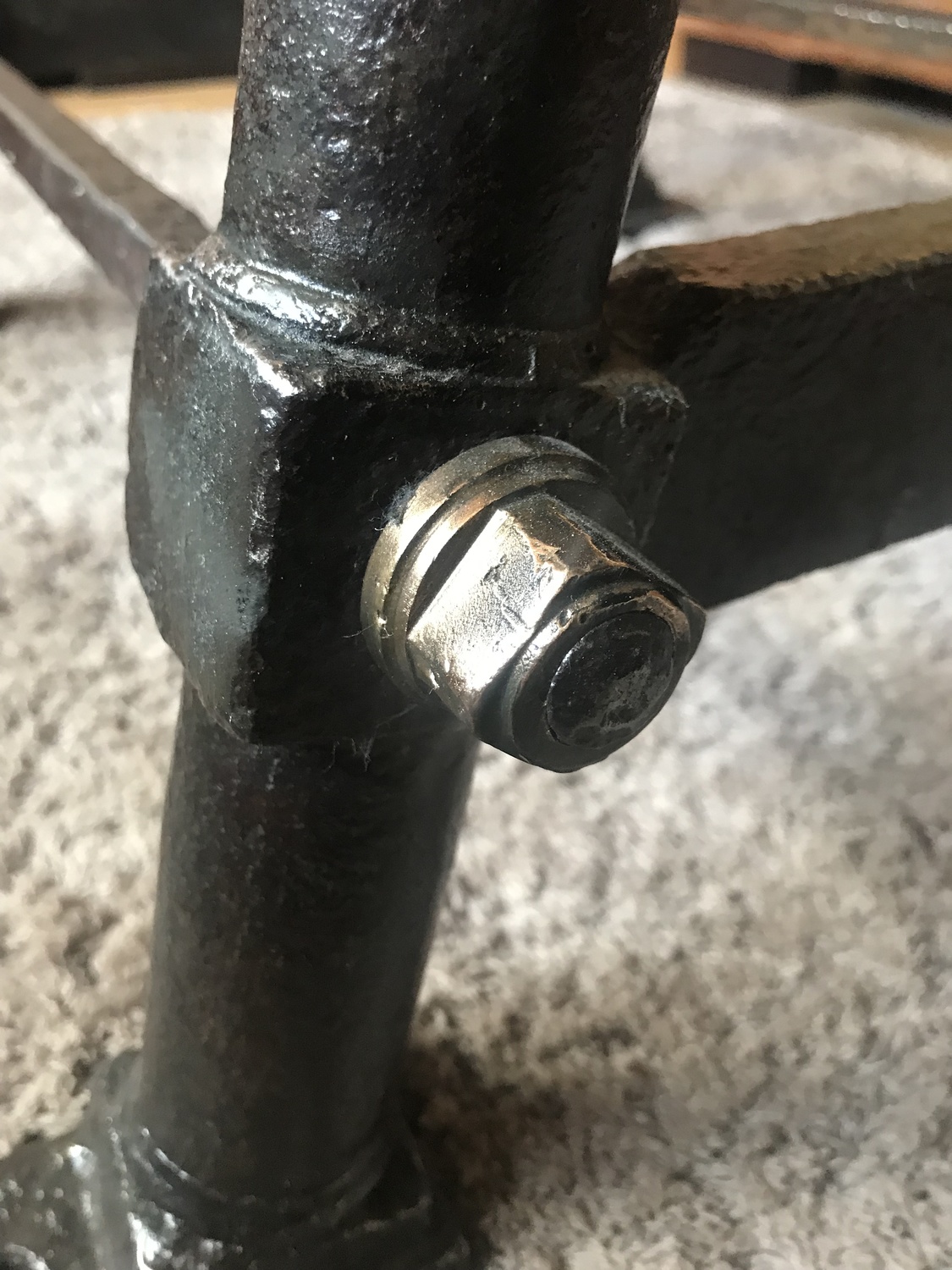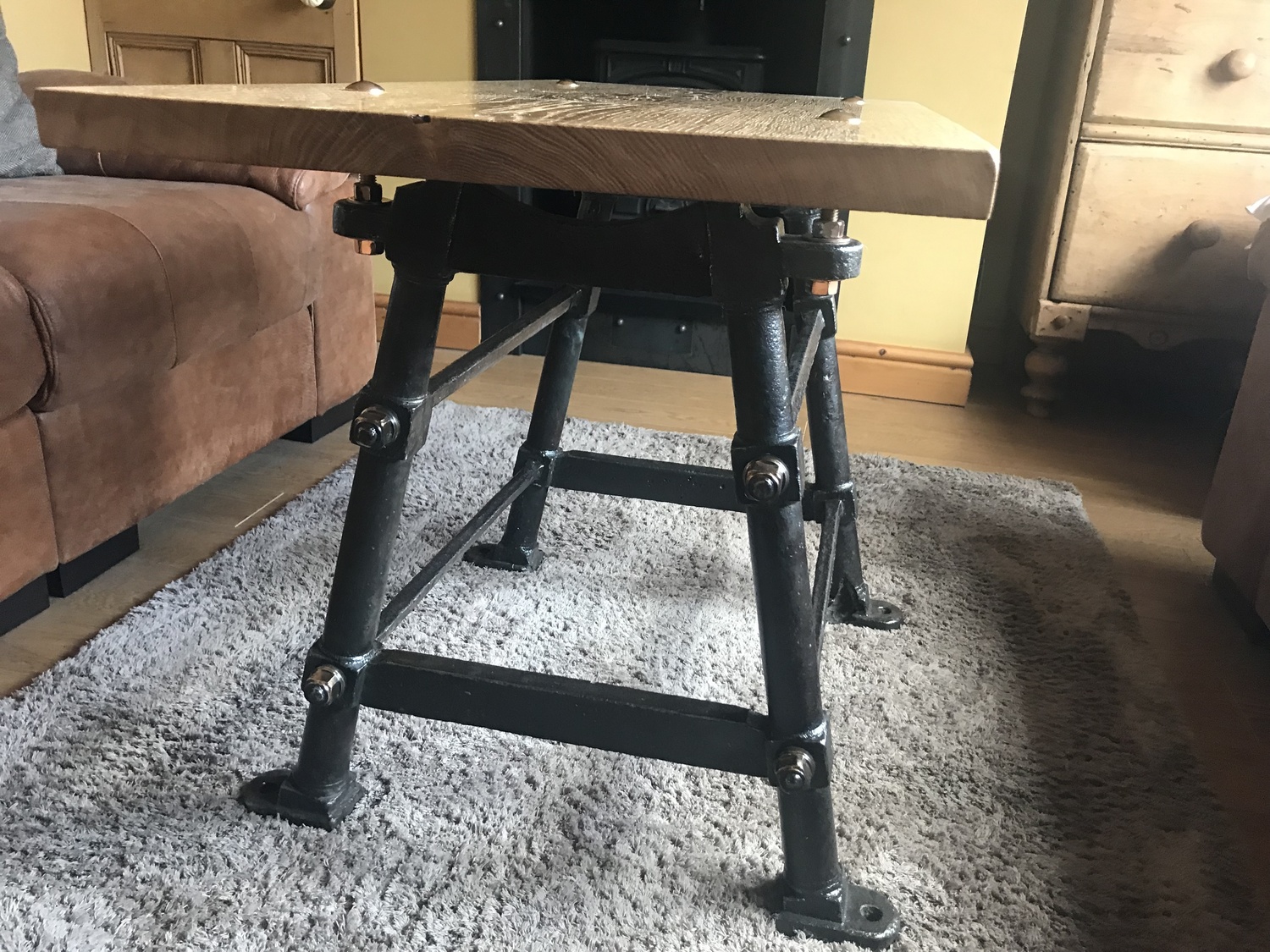 An upcycled project using an old vintage cast iron machine base with bronze fixings. The base has been cleaned, polished and lacquered. The bronze nuts which hold the cast frame together have also been polished and lacquered. 4 bronze coach bolts hold the solid oak table top in place.