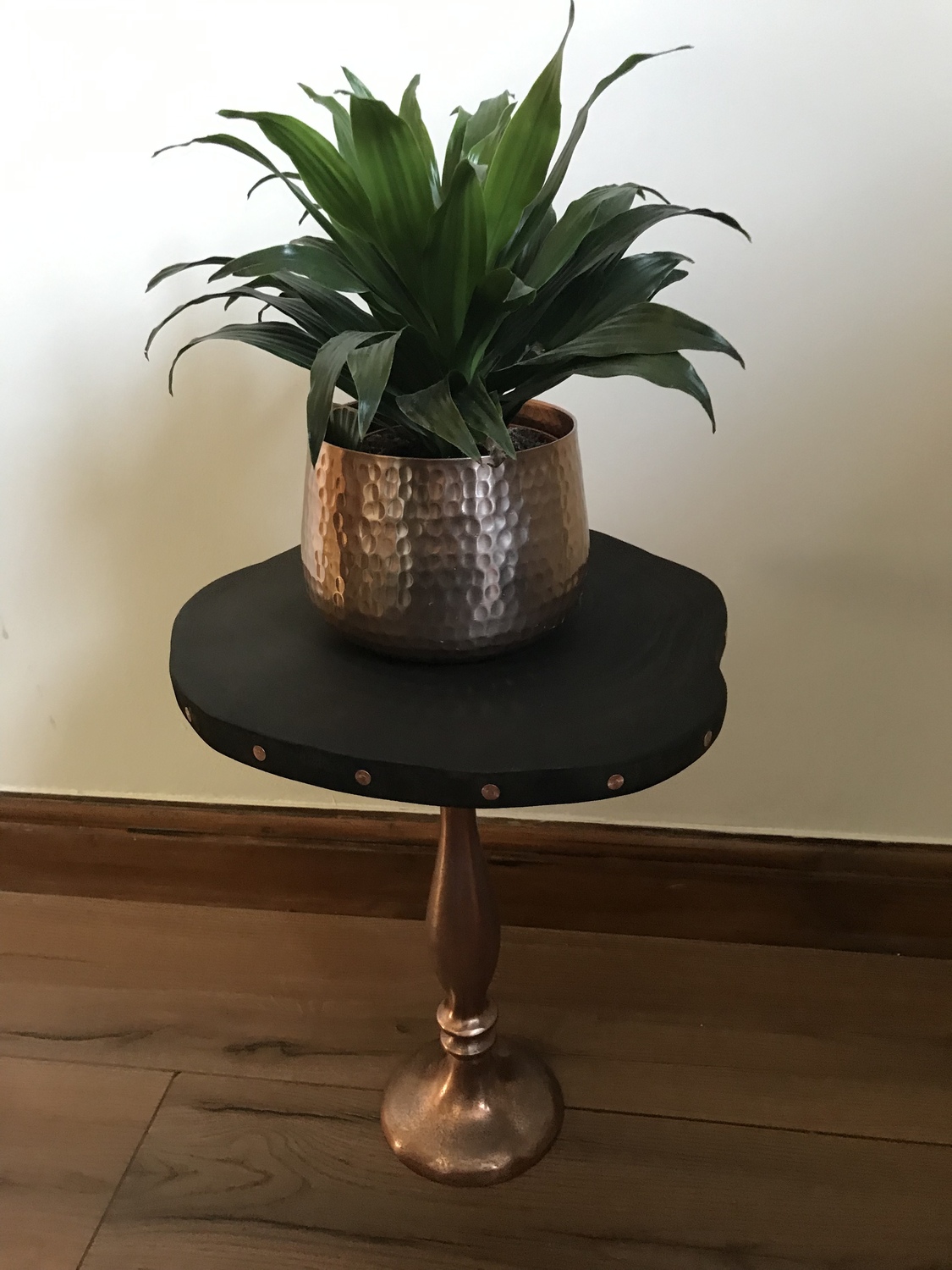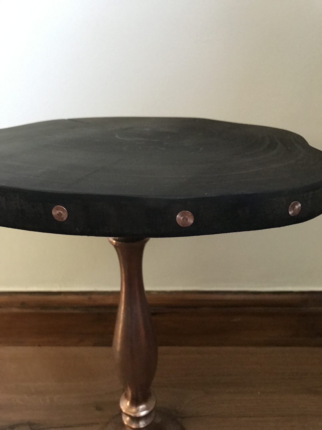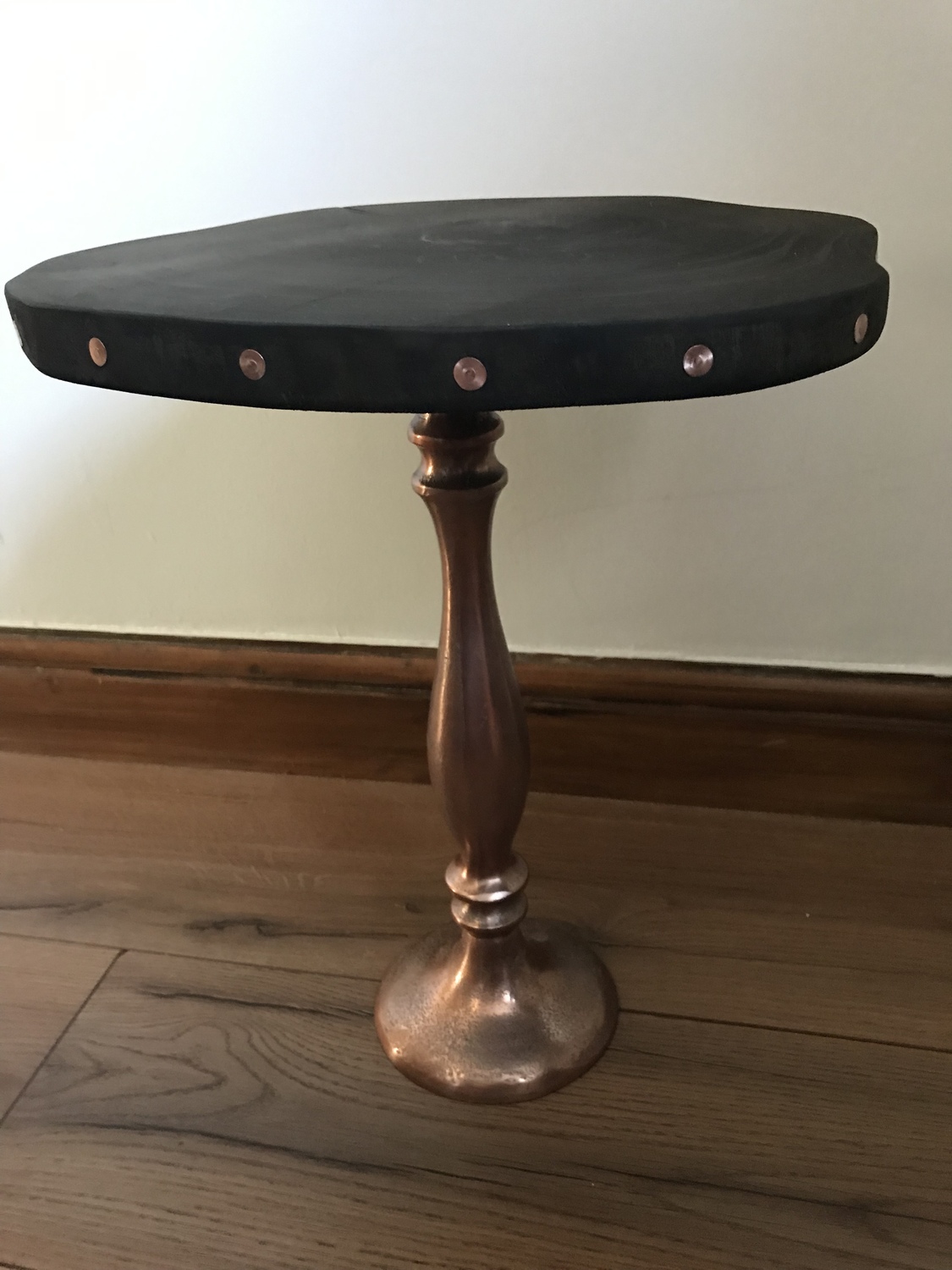 One off project using upcycled stand and reclaimed wooden top and copper nails to complete the look.