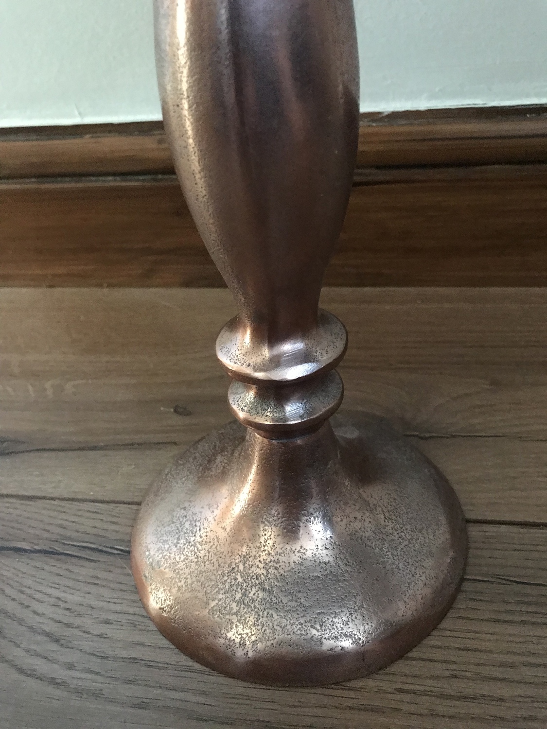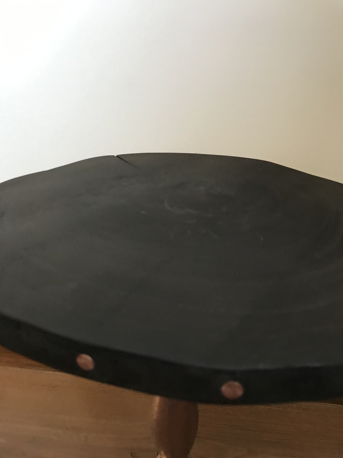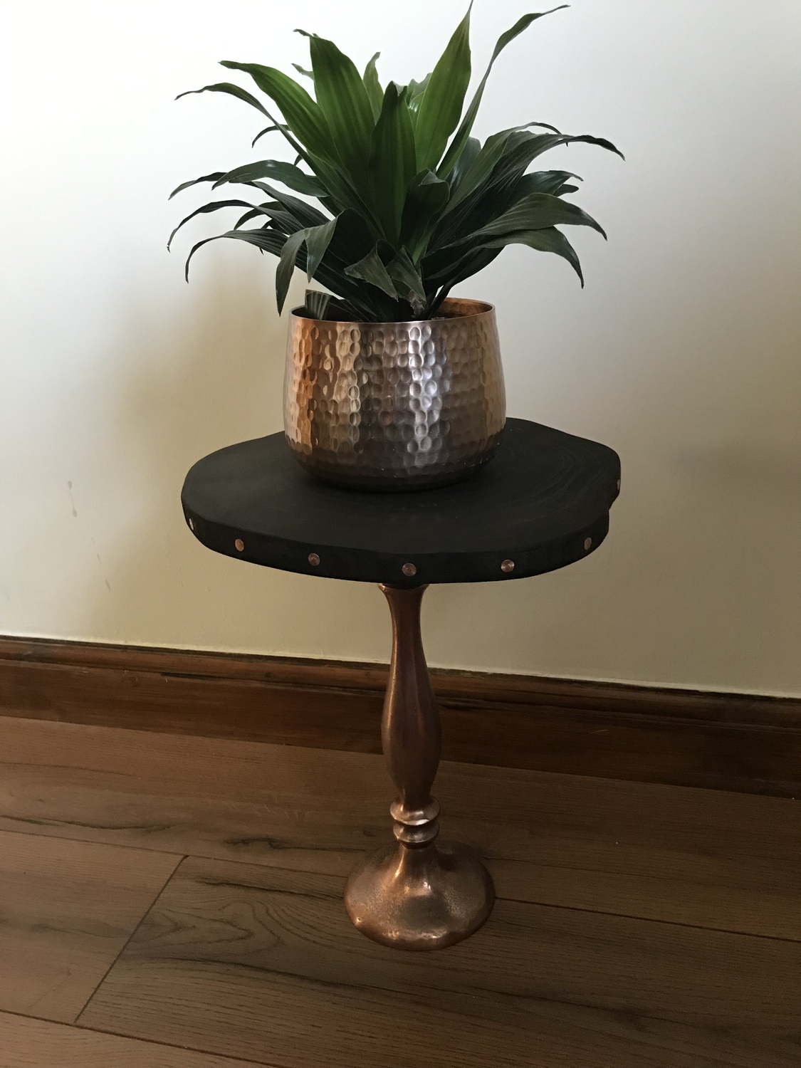 One off project using upcycled stand and reclaimed wooden top and copper nails to complete the look.