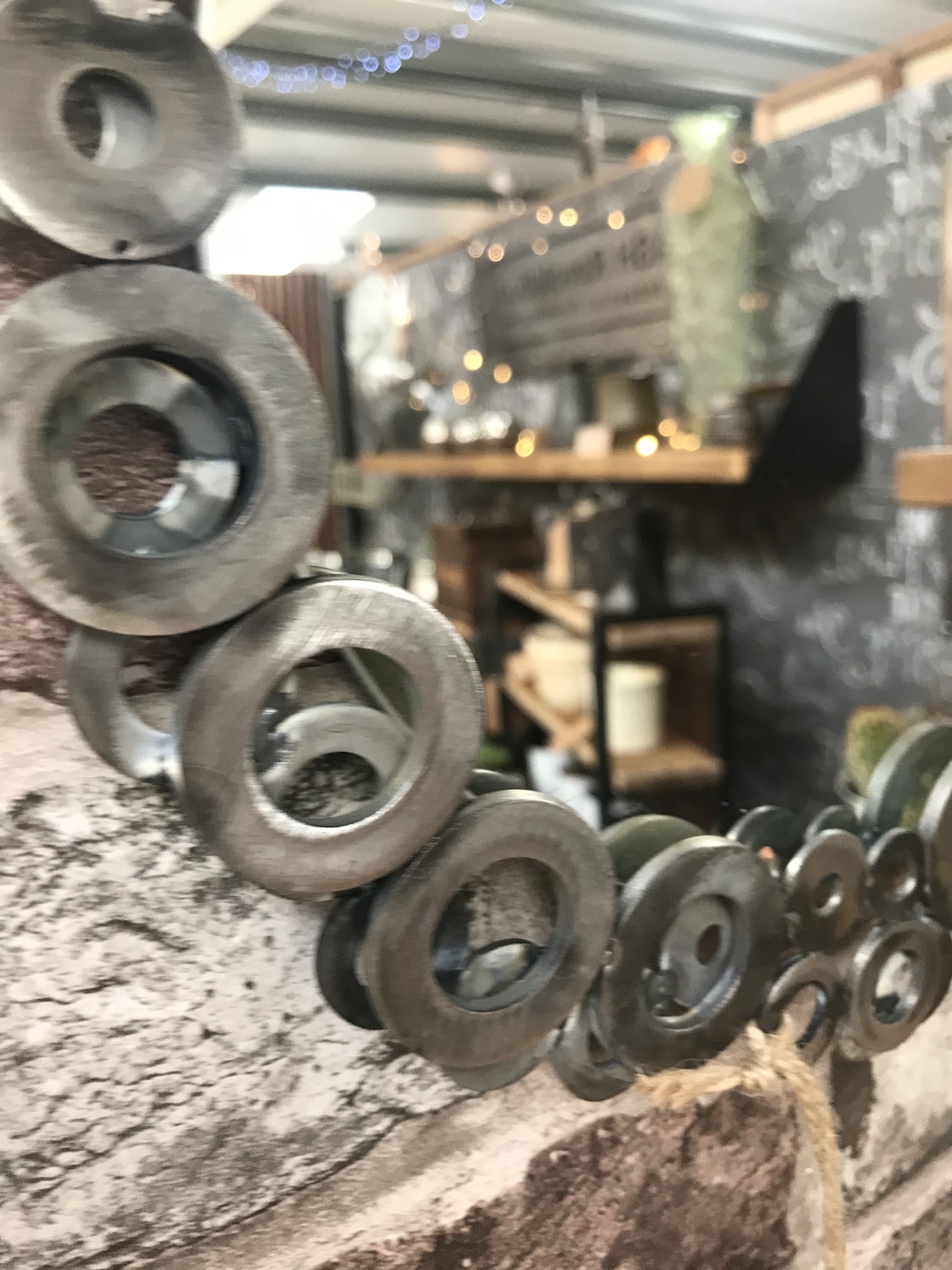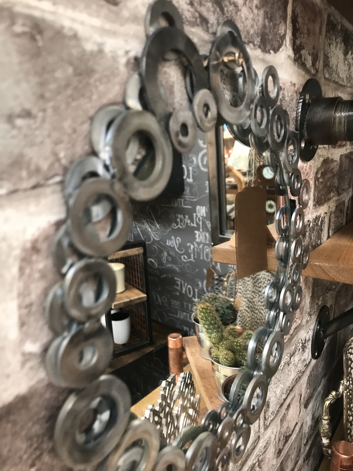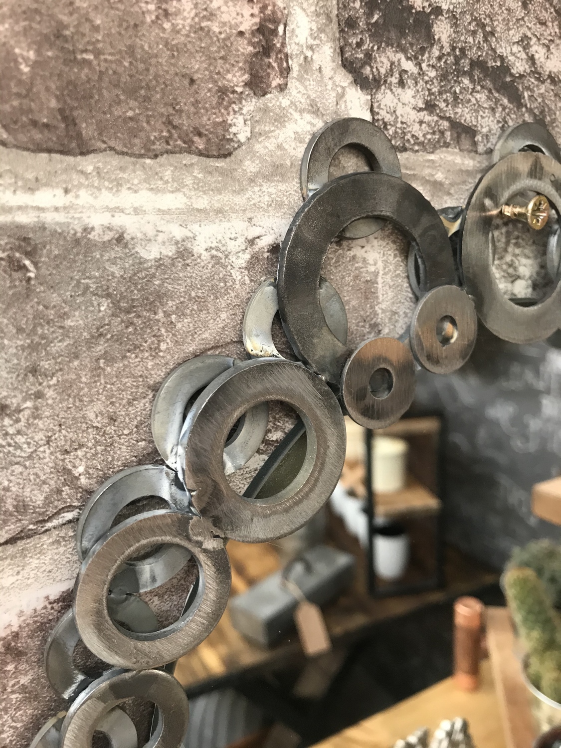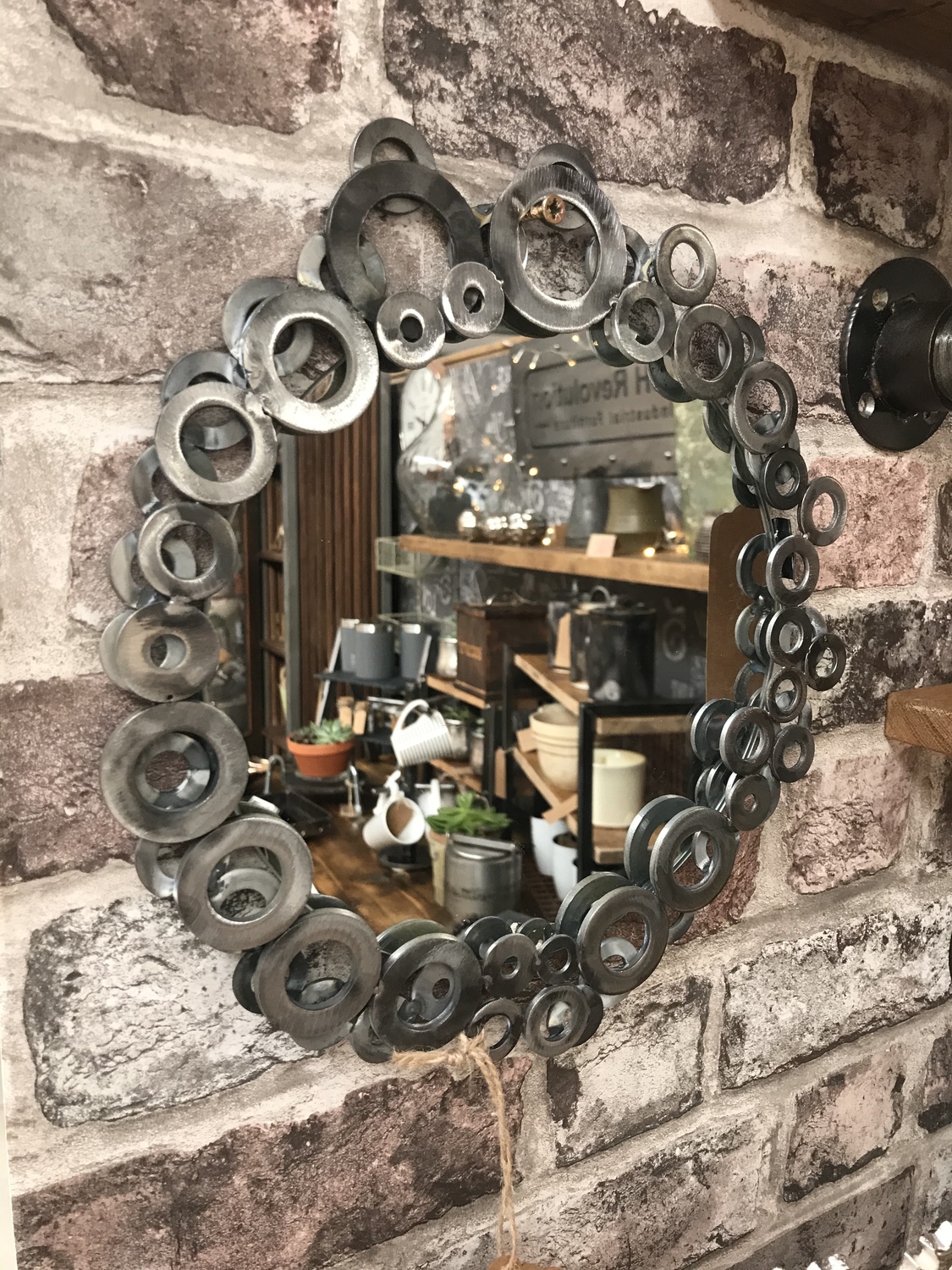 Handcrafted fun one-off project using metal washers welded to make a frame around this upcycled round mirror
