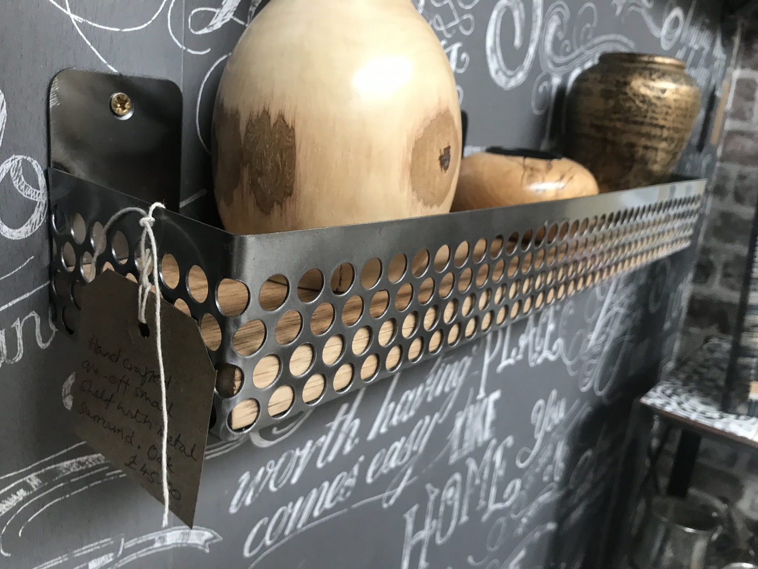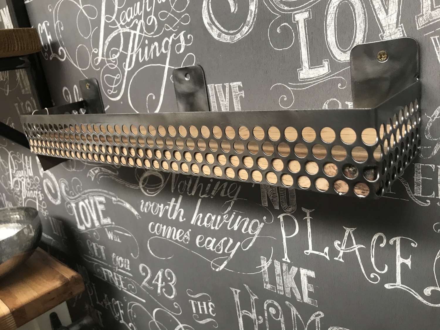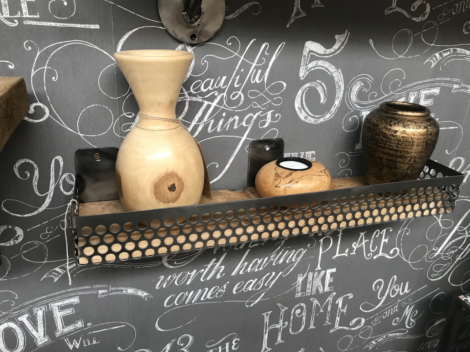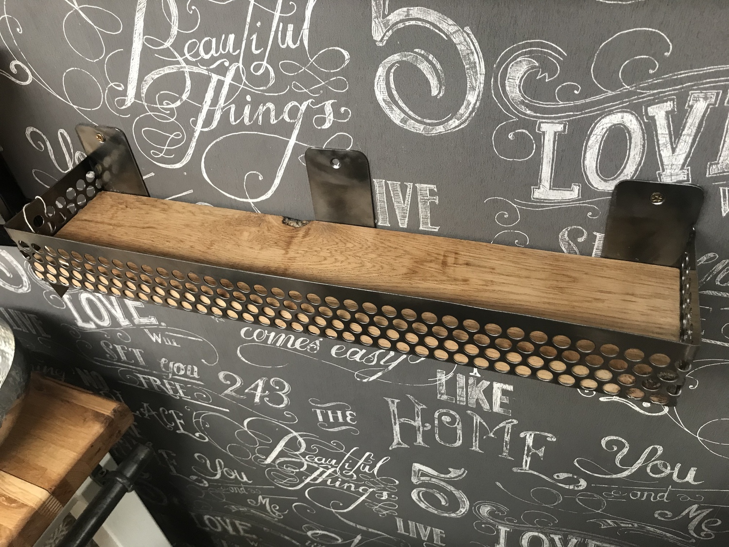 Small shelf handcrafted using reclaimed wood and industrial perforated metal mesh