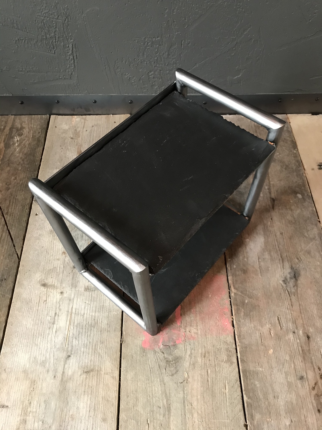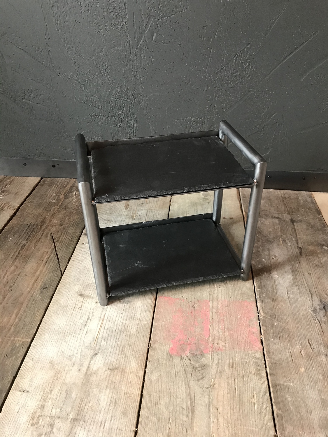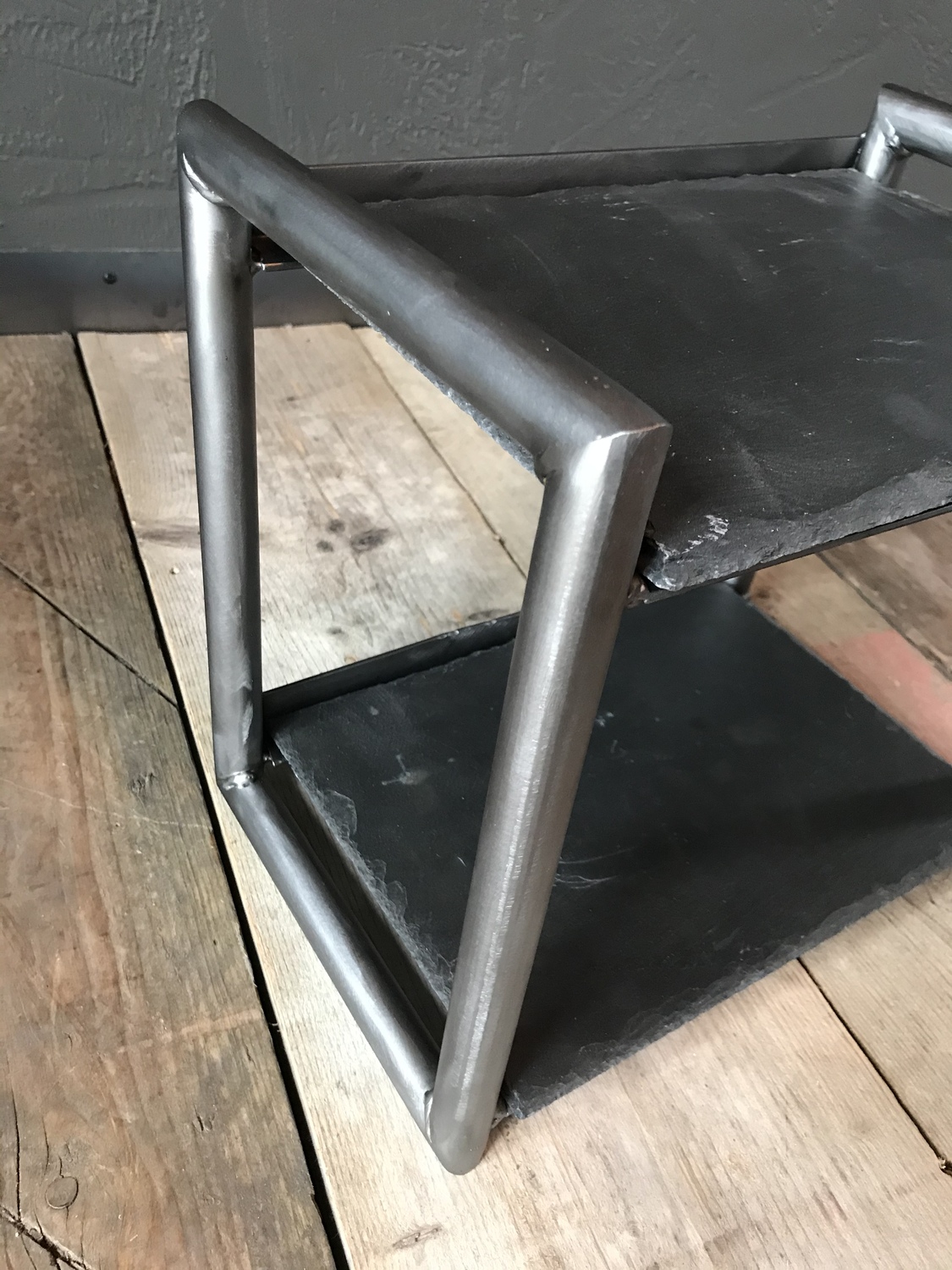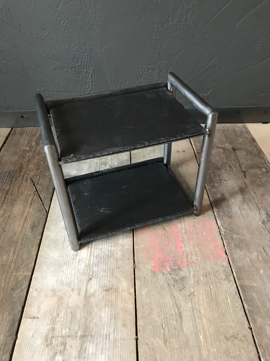 One-off table/counter top stand using black slate as shelves and handcrafted metal frame