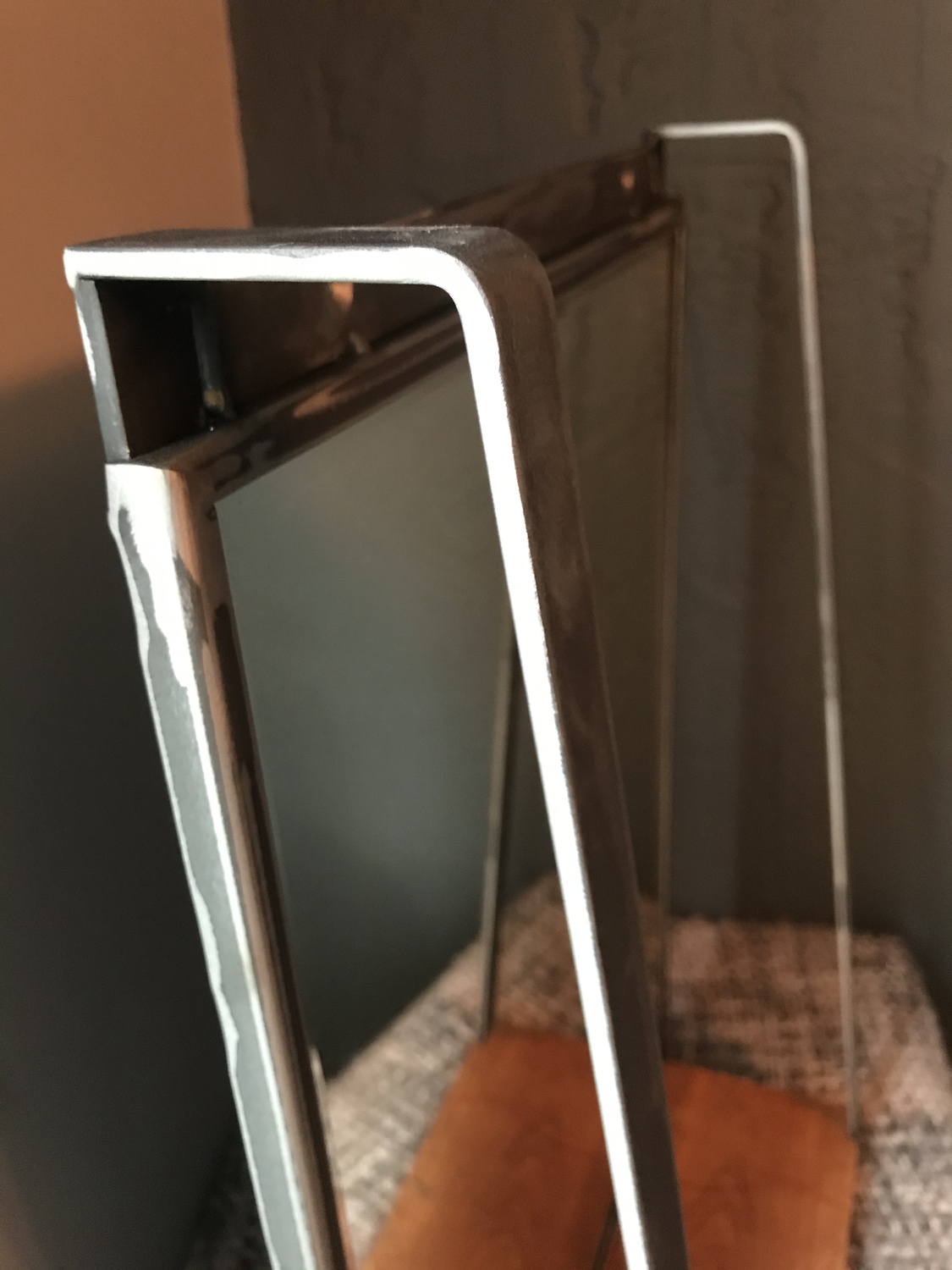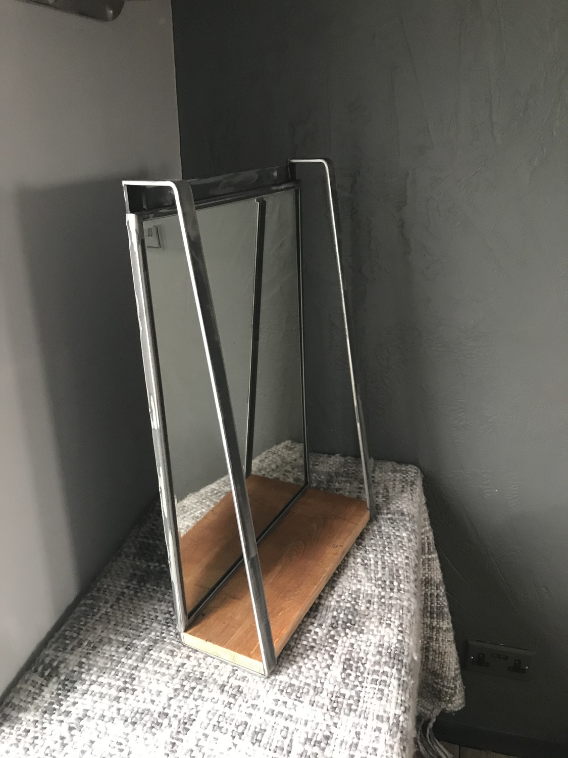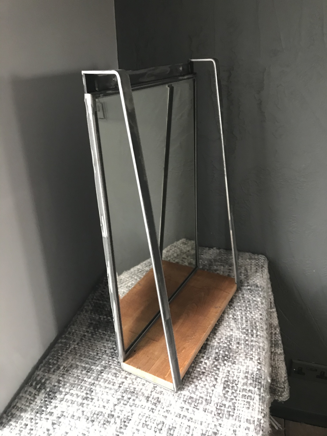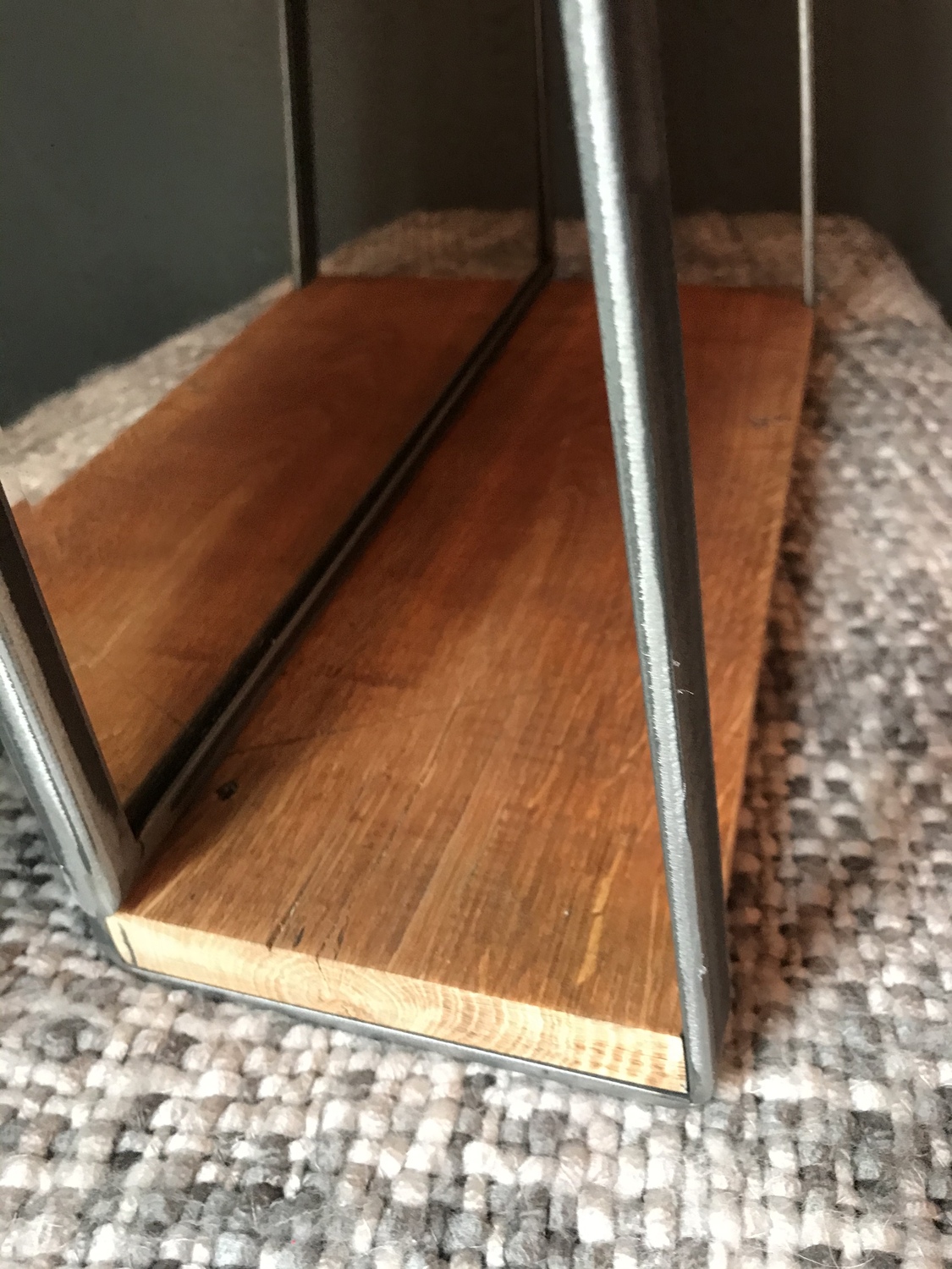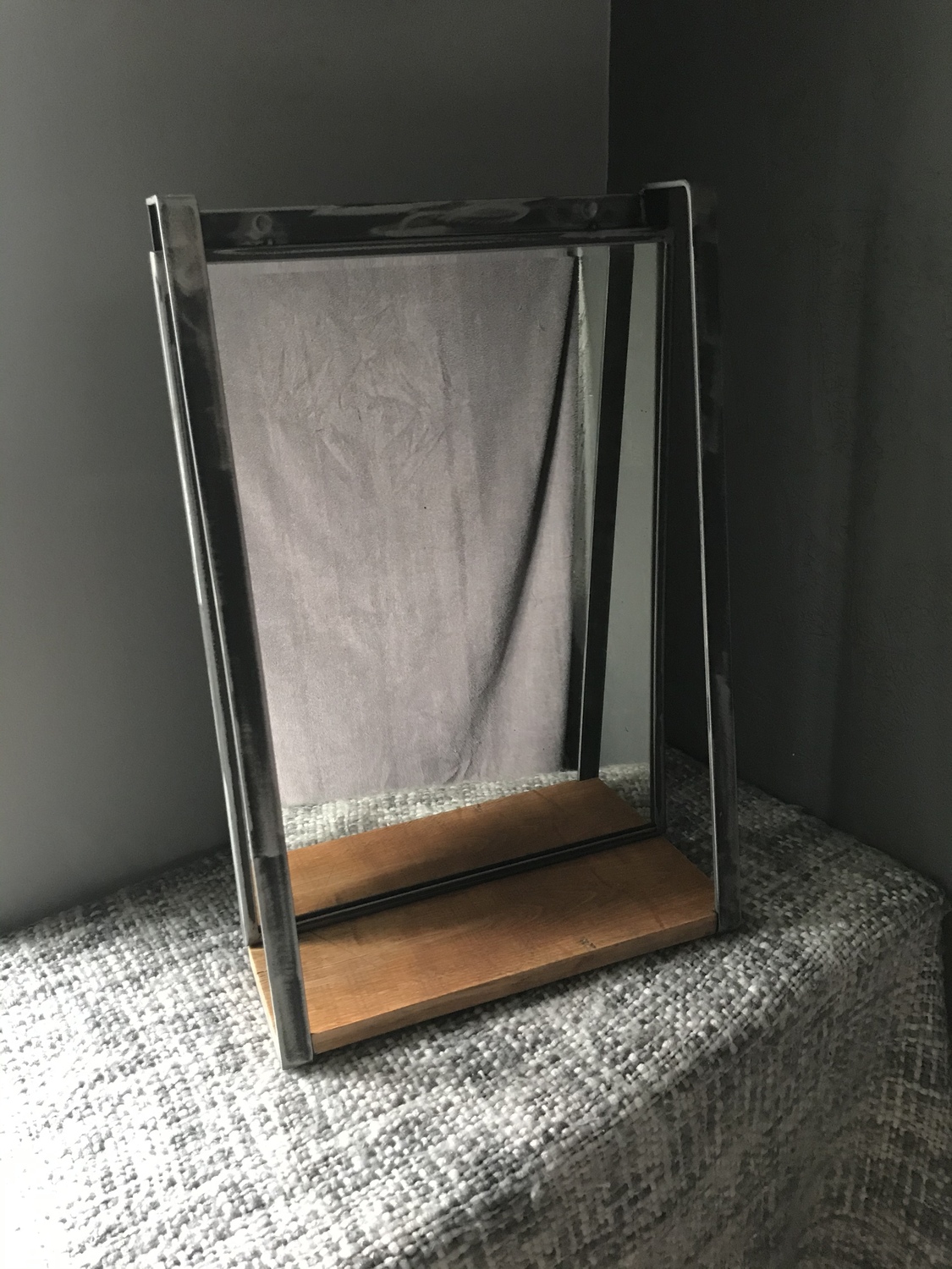 Upcycled mirror with bespoke metal frame and reclaimed oak shelf.