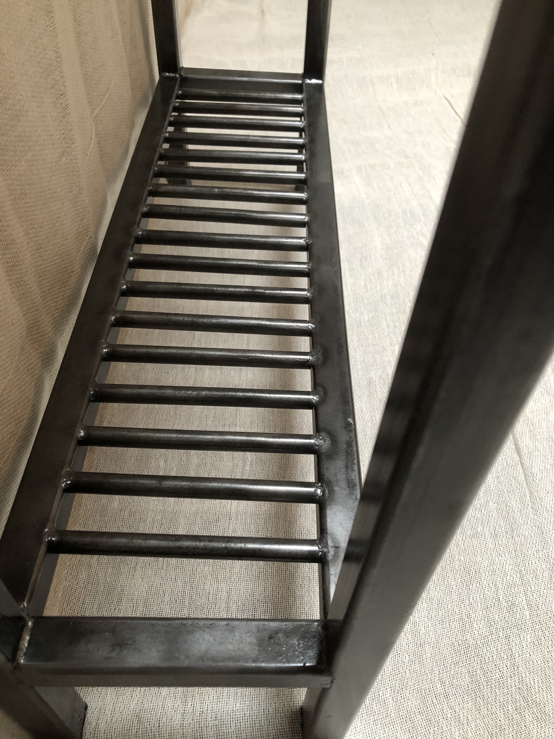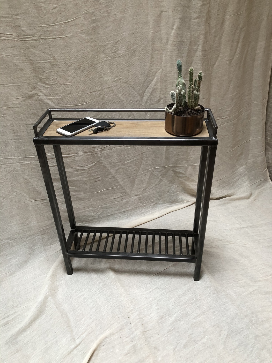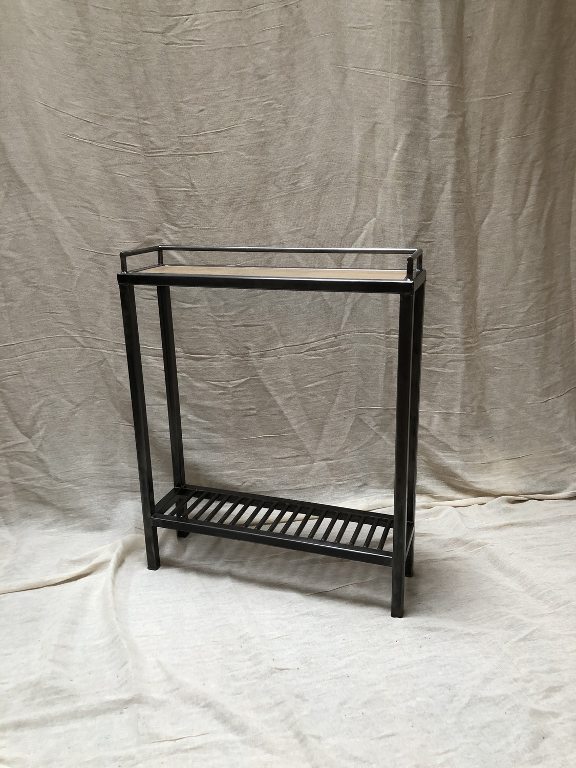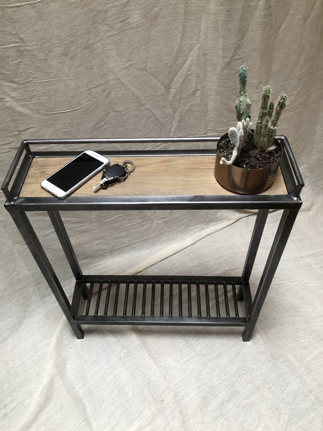 Console table made using reclaimed oak and handcrafted metal cattlegrid shelf. Ideal for narrow areas in the home, eg. entrance hallways. Buff black metal, sealed with lacquer.