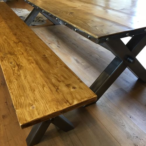 Huge reclaimed wood dining table and two matching benches. Metal X frame leg design on table and benches. Metal trim with rivets around the edge of the table. Very large - 3m x 1.2m, truly a huge piece of furniture made to customer's specification and agreed design. Made to match another piece of furniture we had made previously.
