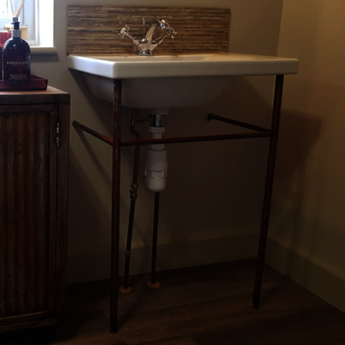 Handmade from scratch, this stand was designed and made to fit the customer's bathroom basin, to their specification and design. The new metal was deliberately rusted and sealed with lacquer to match the bespoke bathroom cupboard. Completely quirky and original. A perfect complement for this unique and stylish bathroom!