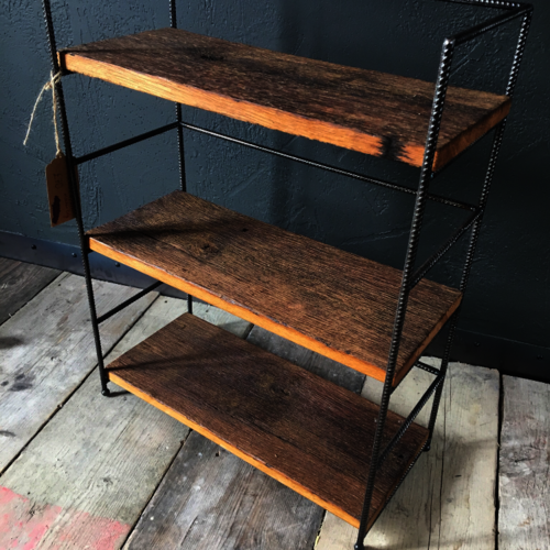Solid oak, rustic shelves with polished reed bar steel frame with welded ball bearing feet.