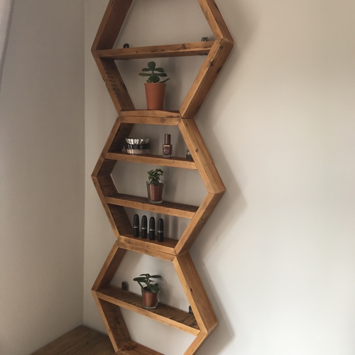 Rustic hexagon shelving system, these can be made to any size and specification. These were used in beauty salon.
