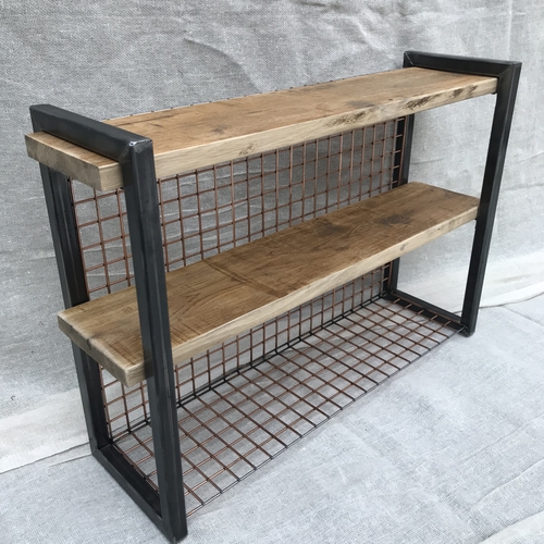Reclaimed oak bespoke shelves with copper coated mesh backing and black box section metal. One off project but similar can be made to customer’s own specification.