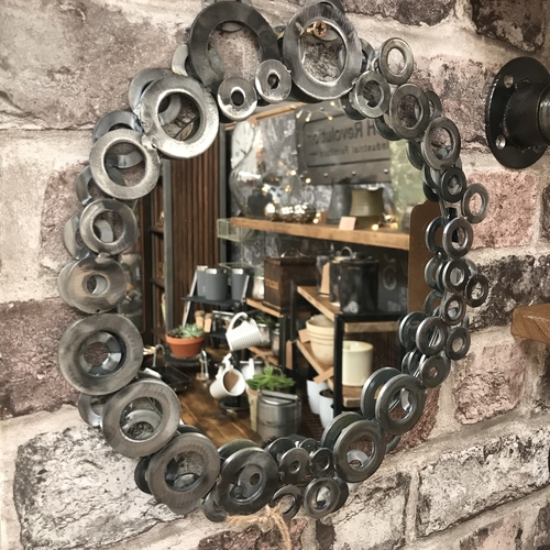 Handcrafted fun one-off project using metal washers welded to make a frame around this upcycled round mirror