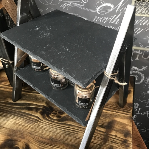 Small handcrafted table/counter top stand with two black slate shelves