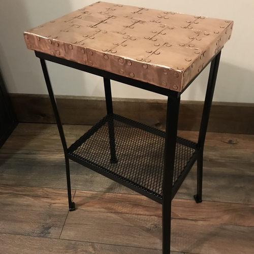 Bespoke copper top table handcrafted for customer to complement other copper top table they purchased from us, with black painted metal legs and mesh shelf
